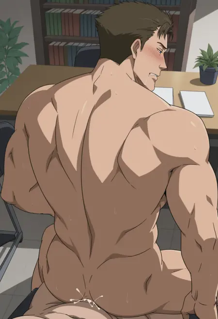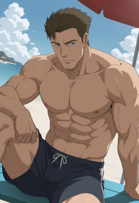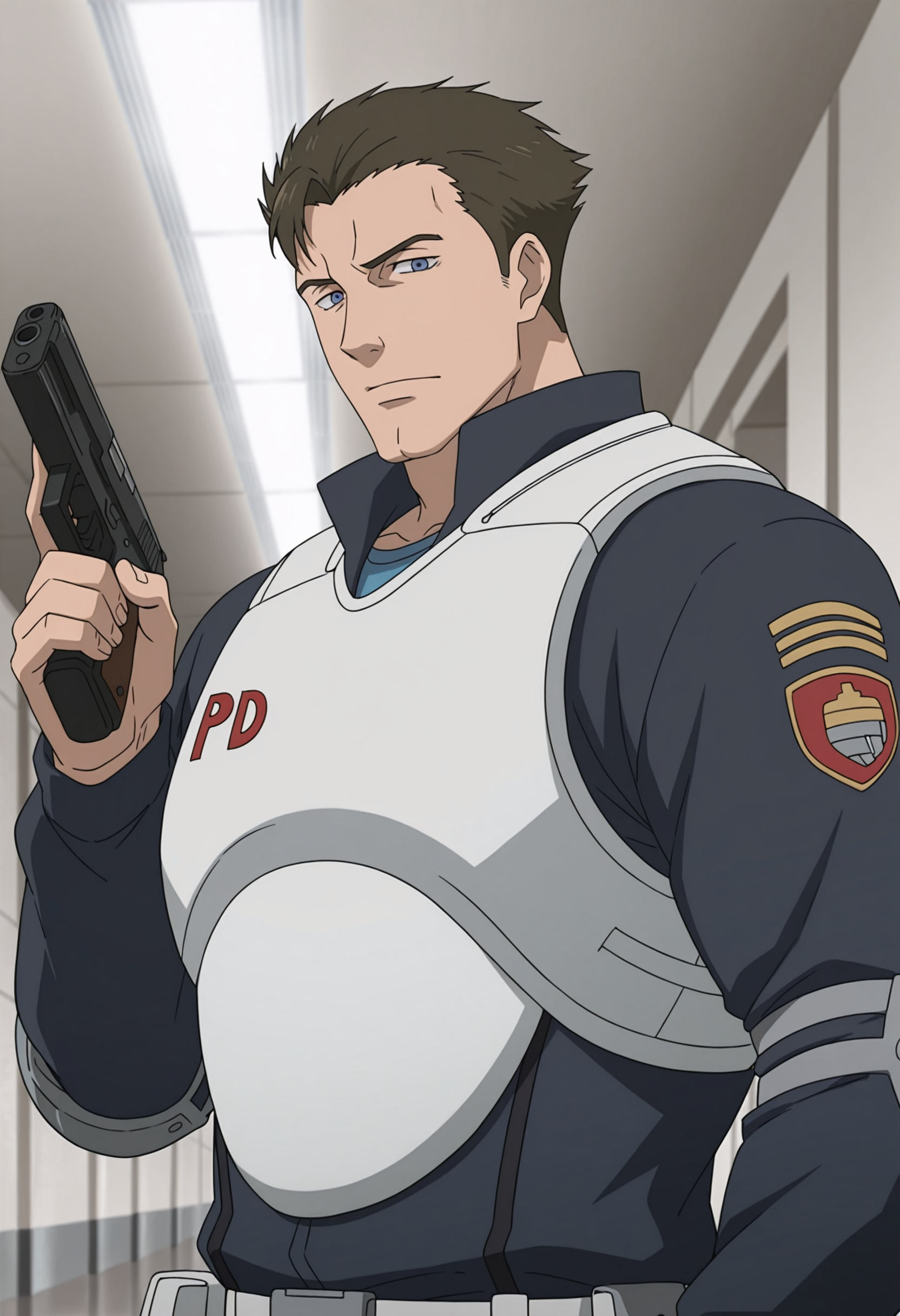 brown hair, cleft chin, short hair, dark blue jacket, arm brace, security uniform, blue eyes, blue undershirt