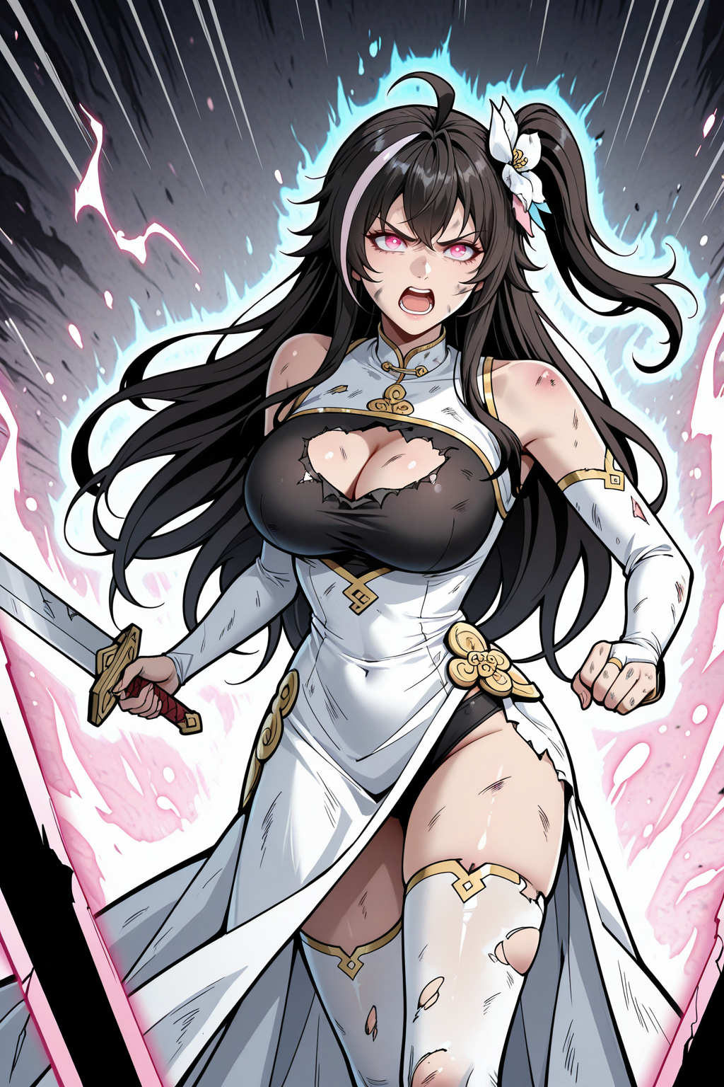 トリガー: ChiXiaoxiao、長い髪、茶色の髪、交差した前髪、サイドポニーテール、あほ毛、一本の髪のストライプ、髪の花、ピンクの目、タートルネックのドレス、中国風の服、サイドスリット、丈の長いドレスの下にタイツ、長いドレス、ゴールドの刺繍、裸の肩、ブライダルガントレット、黒いパンツ、片側のヒップアーマー、白いタイツ、ピンクの靴