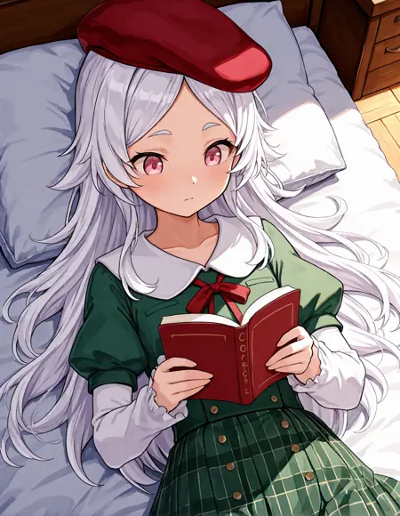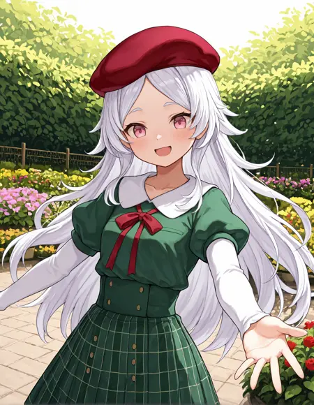 カジュアル衣装: mgrckaharuyuuna, kyncsl, 赤いベレー帽, 緑のシャツ, 白いピューリタンカラー, 赤い胸元リボン, 短い袖が長い袖の上に重なるデザイン, ジュリエット袖, 白い袖, 緑のプリーツスカート