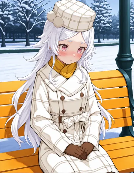 冬の衣装: mgrckaharuyuuna, kynwtr, 白いストライプの帽子, 黄色いスカーフ, 白いストライプの冬用コート, ボウタイ付きの白いストライプのベルト, 茶色の手袋