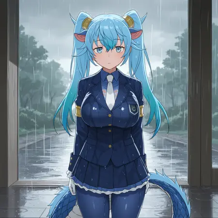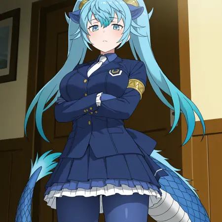 blue jacket, blue suit, white necktie, blue skirt, blue pantyhose, shoes, gloves,