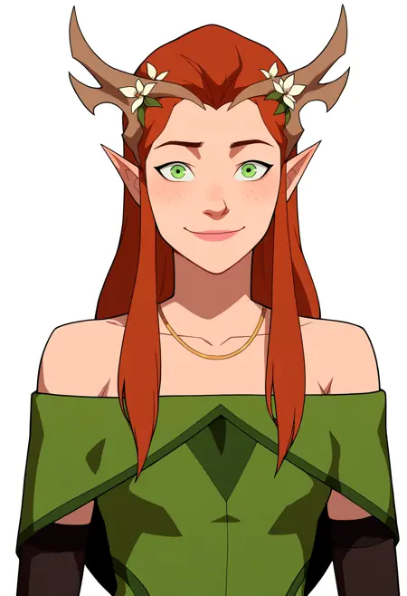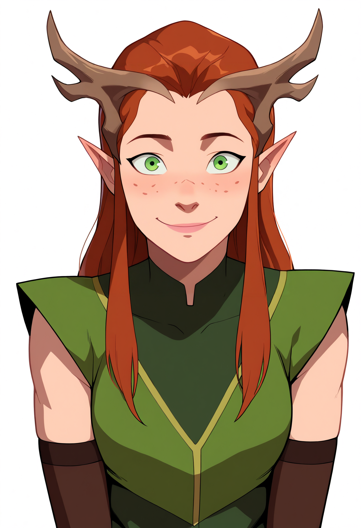 基本プロンプト:1girl, keyleth, ginger hair, green eyes, long hair, pointy ears, antlers crown, freckles