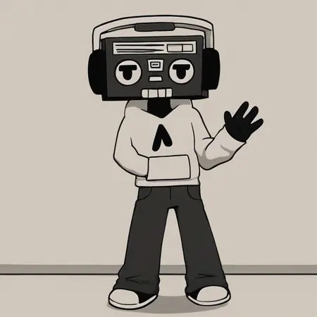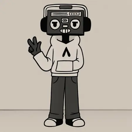 キャラクターレトロcoolmonochromemascot2dcartoonsmileroboturbanhoodiesneakersrelaxedblack skinheadphoneshumanoidthick eyebrowsstreetwearchillsmugplayfulcasual wearwhite hoodieminimalisticblack pantsearmuffsconfidentoversized sweaterlaid-backflared pantssquare headblack shoessmug lookblack jeansbold outlinesretro techradio headsimple shadingboombox charactercartoon machine headrobotic mascot headexpressive tech facequirky headmusic robot aestheticold-school cassette player80s boomboxmusic-themed headgearside attachmentsearmuff-style speakerslarge headphonesminimal shadingblack-and-white facemonochrome headcartoony teethrelaxed facehalf-lidded eyesslanted eyebrowsretro stereo headspeaker grille eyestop panel buttonsradio buttonstape teethcassette deck mouthboxy silhouetteblocky headrectangular headlarge, round earmuff-like headphones attached to the sides, emphasizing the music/boombox theme.mostly black and white with strong outlines, simple monochrome aesthetic.cassette tape detail in the “mouth” area, stylized to resemble teeth.buttons and knobs across the top edge, referencing cassette player controls.eyebrows: thick, angled details above the eyes, giving a laid-back or smug expression.mouth: a cassette deck positioned as a wide mouth with a toothy, blocky smile.eyes: two rounded speaker grilles acting as eyes, giving it an expressive and cartoony look.rectangular boombox headblack shoes with white accentmodern cartoon styleblack-and-white aesthetichoodie strings connected to each otherpointed tipped hoodie stringsblack hoodie stringsarrow shaped hoodie stringspocketed hoodiepeace sign hand gesturecomfy outfittape deck mouthmouth as buttonsspeaker eyesrectangle-shaped headcassette player faceboombox headwhite headphone handleblack headphone earmuffsmonochrome headphonesblack and white headphones