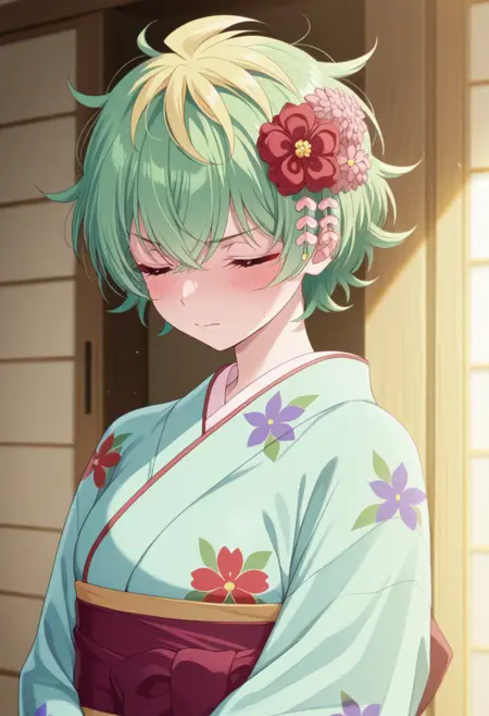 Trigger Words: mikadono miwa, short hair, green hair, multicolored hair, blonde hair, yellow eyes