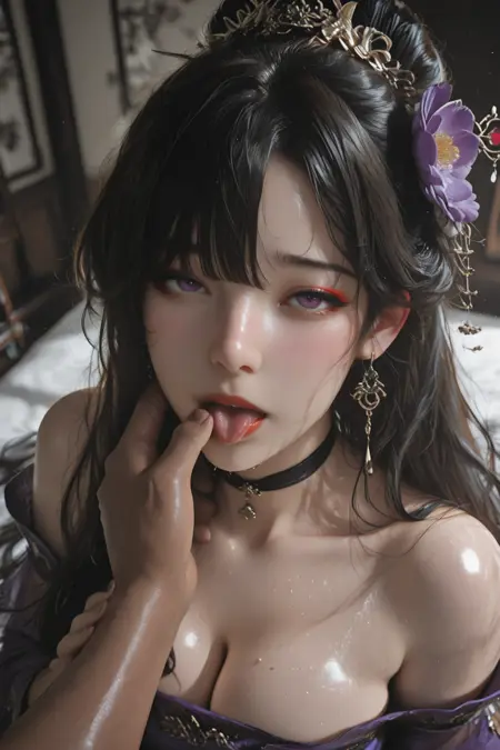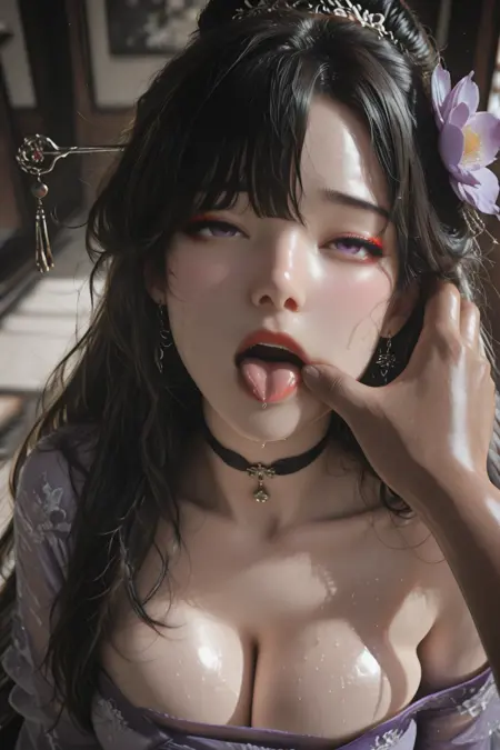 1girl, solo, 성숙한 여성, 무협, 검은 머리, 비현실적으로 긴 머리, 머리묶음, 반올림 스타일, 갈라진 머리, 물결치는 머리, 긴 앞머리, 머리핀, 왕관 모양 머리 장식, 꽃 장식, 메이크업, 얇은 입술, 빨간 립스틱, 견갑골, 거대한 가슴, 목걸이, 귀고리