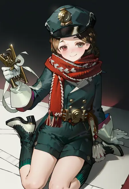 ema1999, 1girl, solo, short hair, brown hair, braid, heterochromia, eyepatch, military uniform, green jacket, peaked cap, red scarf, buttons, long sleeves, belt, brown belt, belt buckle, pouch, belt pouch, brown bag, white gloves, green shorts, green socks, white shoe, fringe trim