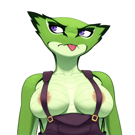 vyper \(deadlock\), clothing, overalls, suspenders, shorts, belt, scalie, reptile, green scales, purple eyes, 4 fingers, 2 toes, sharp teeth,