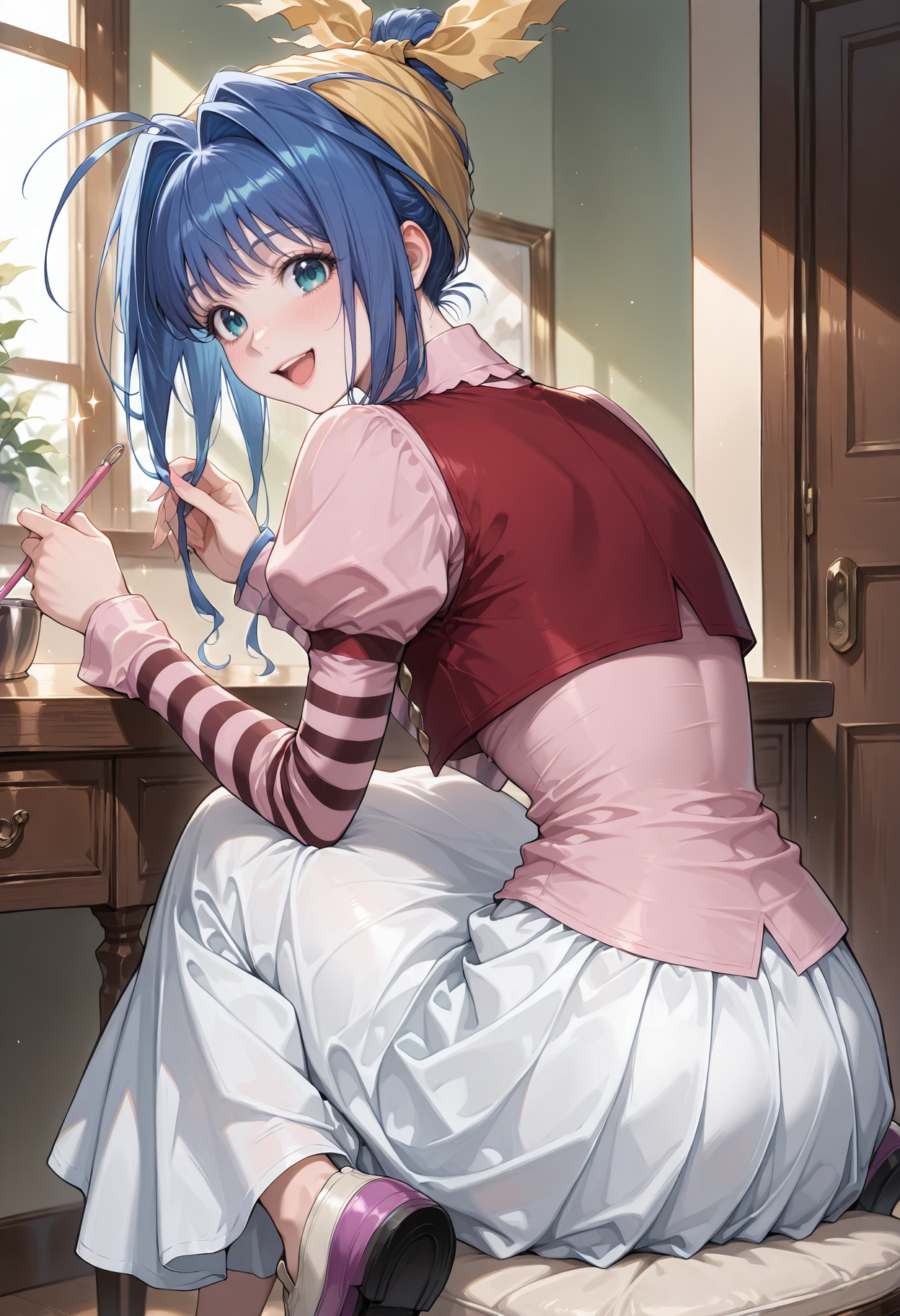 衣装: ポニーテール、髪の巻き取り、リボン、髪のリボン、黄色いリボン、リボン、ベスト、シャツ、縞模様、ジュリエット袖、ふくらはぎ袖、スカート、白いスカート、長いスカート、靴、茶色の靴