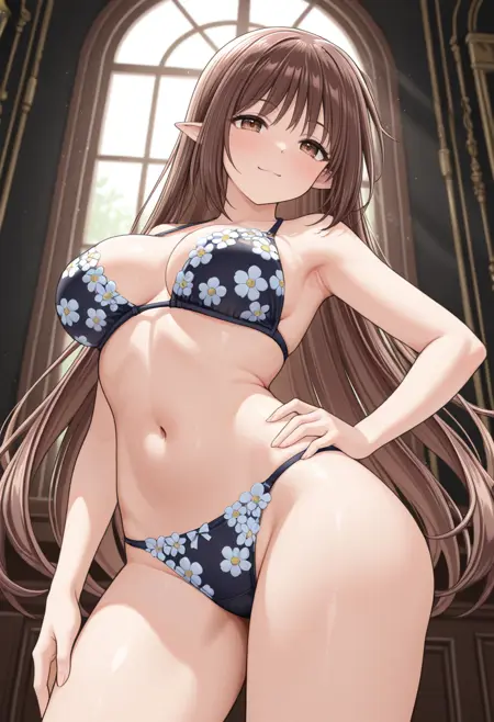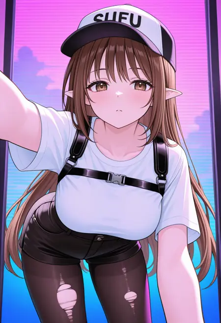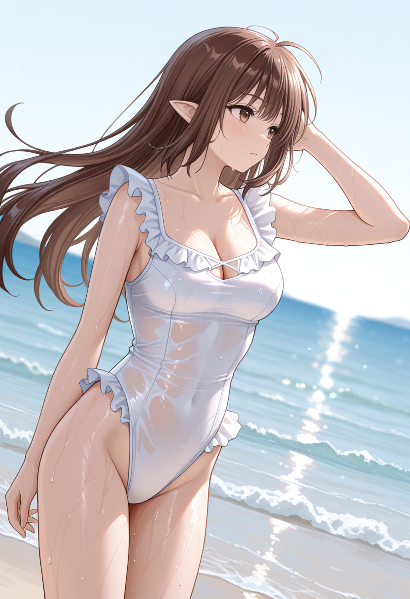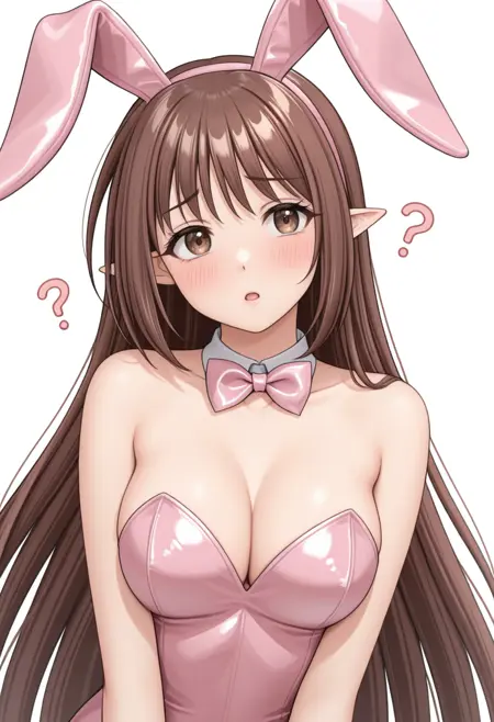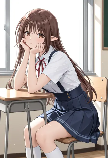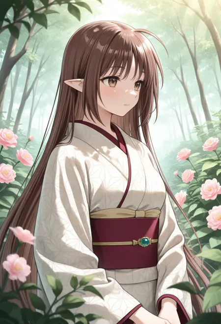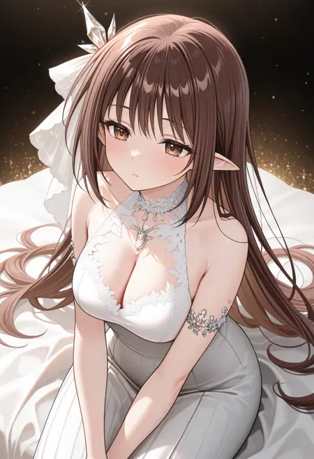 Shuffl3L1is14nthus, 1girl, brown eyes, brown hair, long hair, bangs, pointy ears