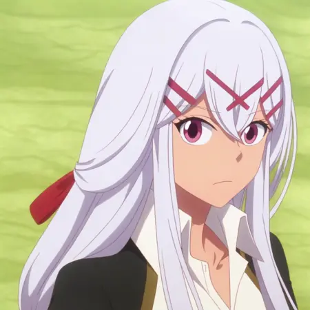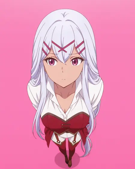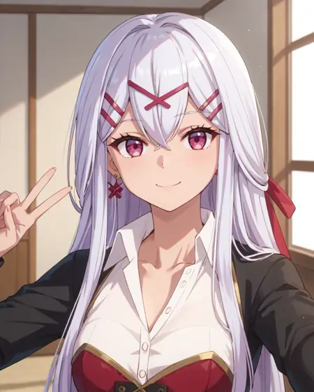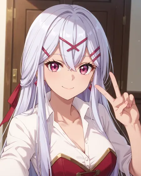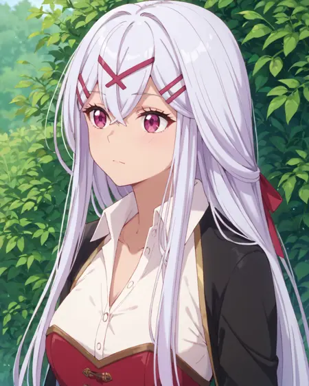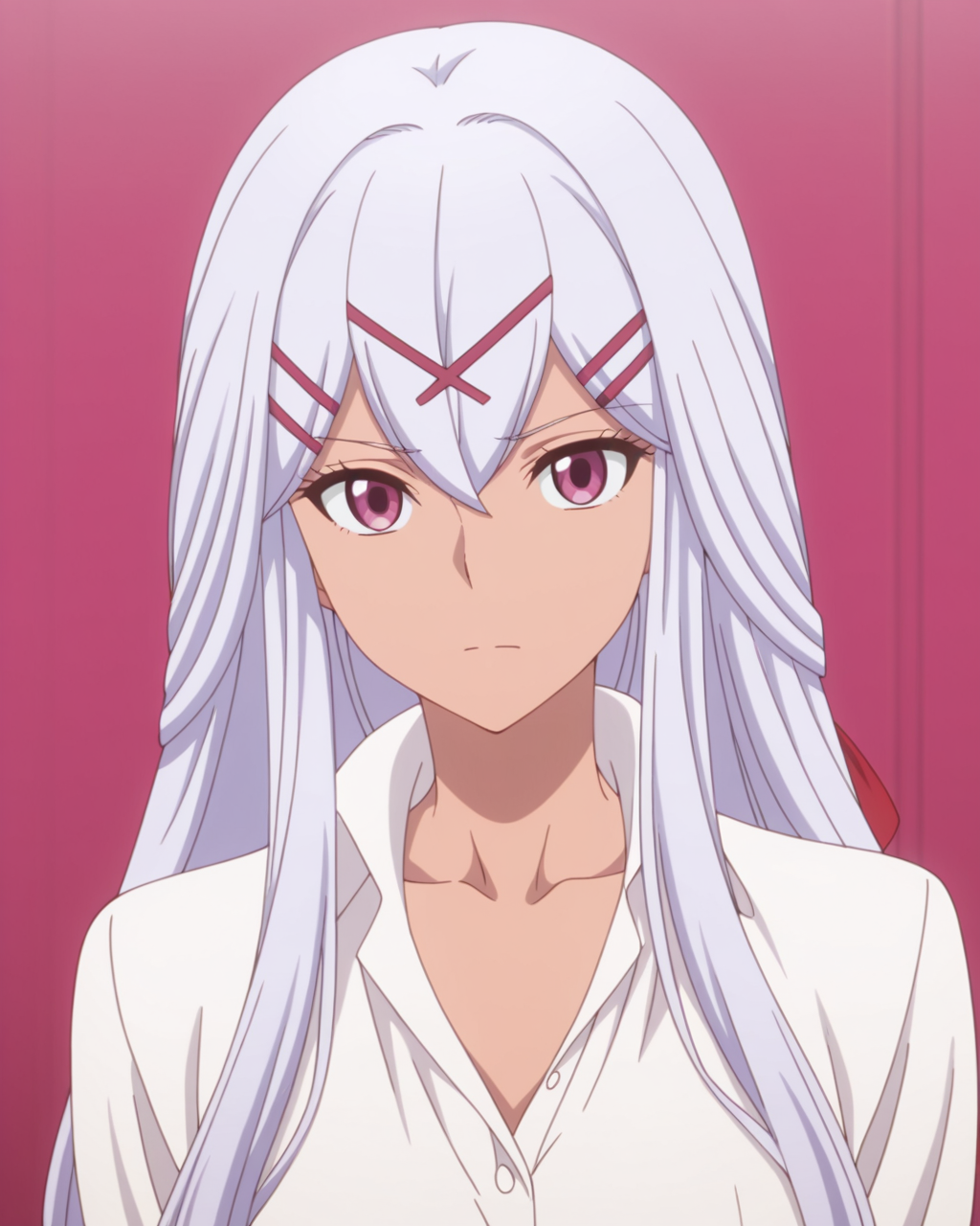 Yulicia,粉红洋红色眼睛,银白色长发,非常长的头发,低扎长发,发饰,头发位于双眉之间,发夹,x发饰,1个女孩,单独,看着观众,上半身,衬衫,白衬衫,锁骨,闭嘴,动漫上色