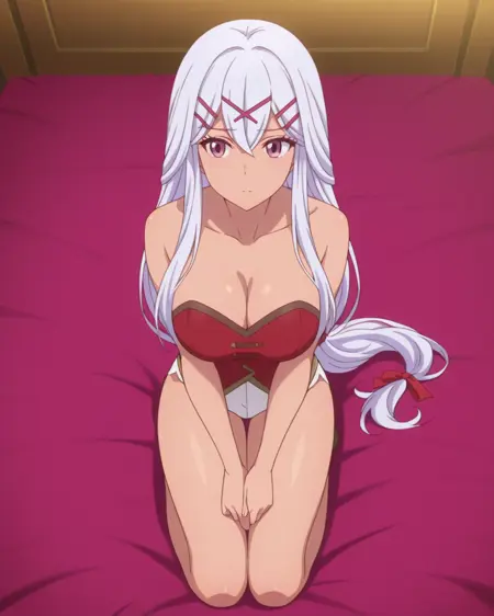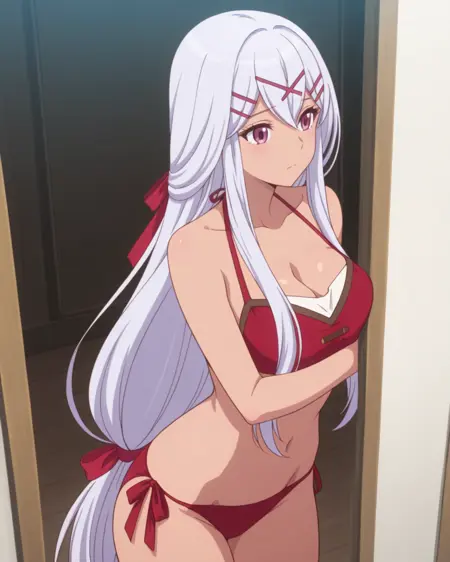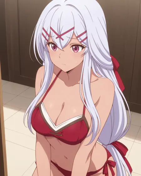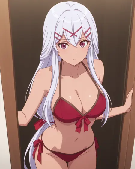Yulicia,粉红洋红色眼睛,银白色长发,非常长的头发,低扎长发,发饰,头发位于双眉之间,发夹,x发饰,1个女孩,单独,胸部,红色比基尼,乳沟,侧系比基尼下装,丝带