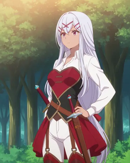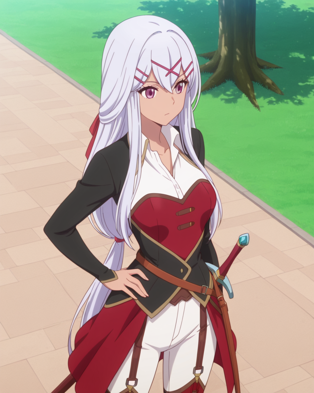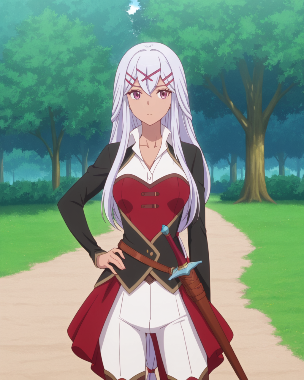 Yulicia,粉红洋红色眼睛,银白色长发,非常长的头发,低扎长发,发饰,头发位于双眉之间,发夹,x发饰,1个女孩,单独,过膝袜,剑鞘,户外,手扶腰,裤子,树,白色长裤,站立,剑已入鞘