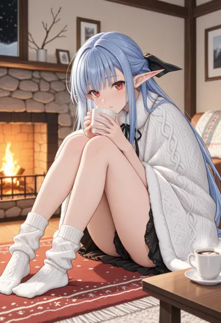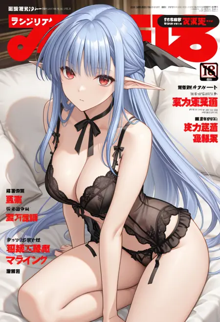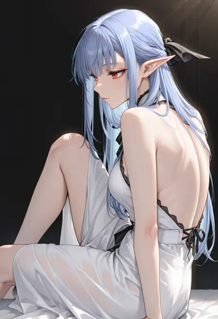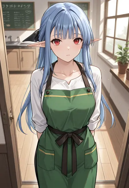 Shuffl3N3r1in3, 1girl, blue hair, long hair, pointy ears, bangs, half updo, black ribbon, red eyes