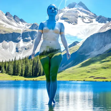 c4m0ufl4ge, photo of a woman with transparent skin standing in front of a lake with a skyline, front view