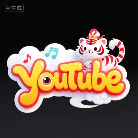 White background,colorful cartoon game logo,text "youtube" using a dynamic artistic font,presented in bright yellow,colorful colors,red,the font is rounded and three-dimensional,with a glossy effect,resembling jumping notes,and incorporating cute xianxia elements,such as an image with tiger characteristics,white fur and red decorations,lively and playful,with a raised tail adding a lively feeling. The overall logo design showcases the fantasy of the xianxia world,while the cute elements bring a relaxed and pleasant atmosphere,as if it can instantly lead people into a xianxia daily filled with adventures. A playful eye on the first character,the entire logo is decorated with clouds.,