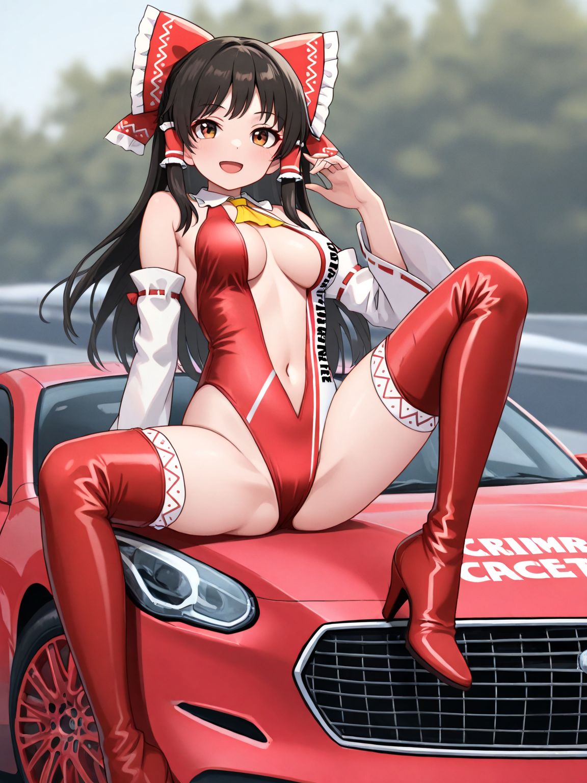race queen,hakurei reimu,breasts,medium breasts,ascot,yellow ascot,black hair,long hair,bare shoulders,bow,brown eyes,detached sleeves,white sleeves,ribbon-trimmed sleeves,long sleeves,frilled bow,frilled hair tubes,frills,hair tubes,red bow,hair bow,highleg,highleg leotard,leotard,backless outfit,backless leotard,red leotard,clothes writing,center opening,navel,navel cutout,red footwear,ribbon,ribbon trim,thighhighs,red thighhighs,boots,thigh boots,high heel boots,high heels
