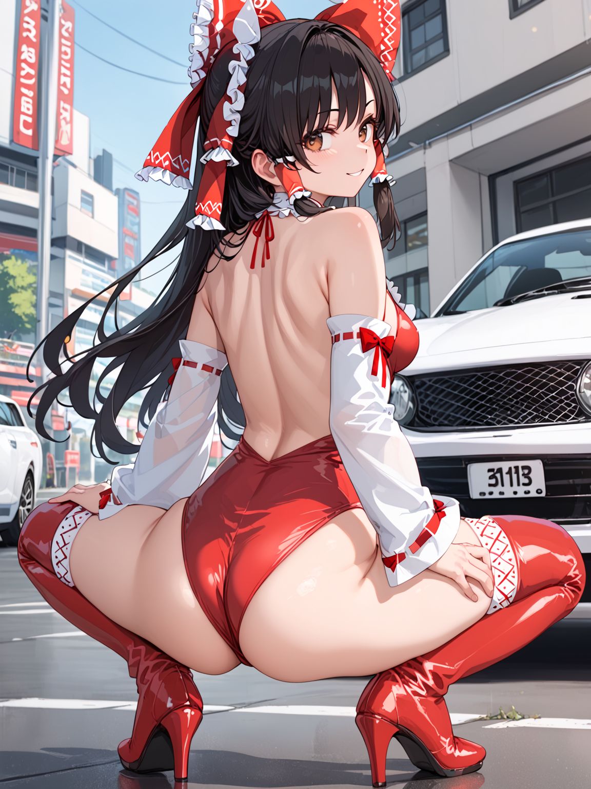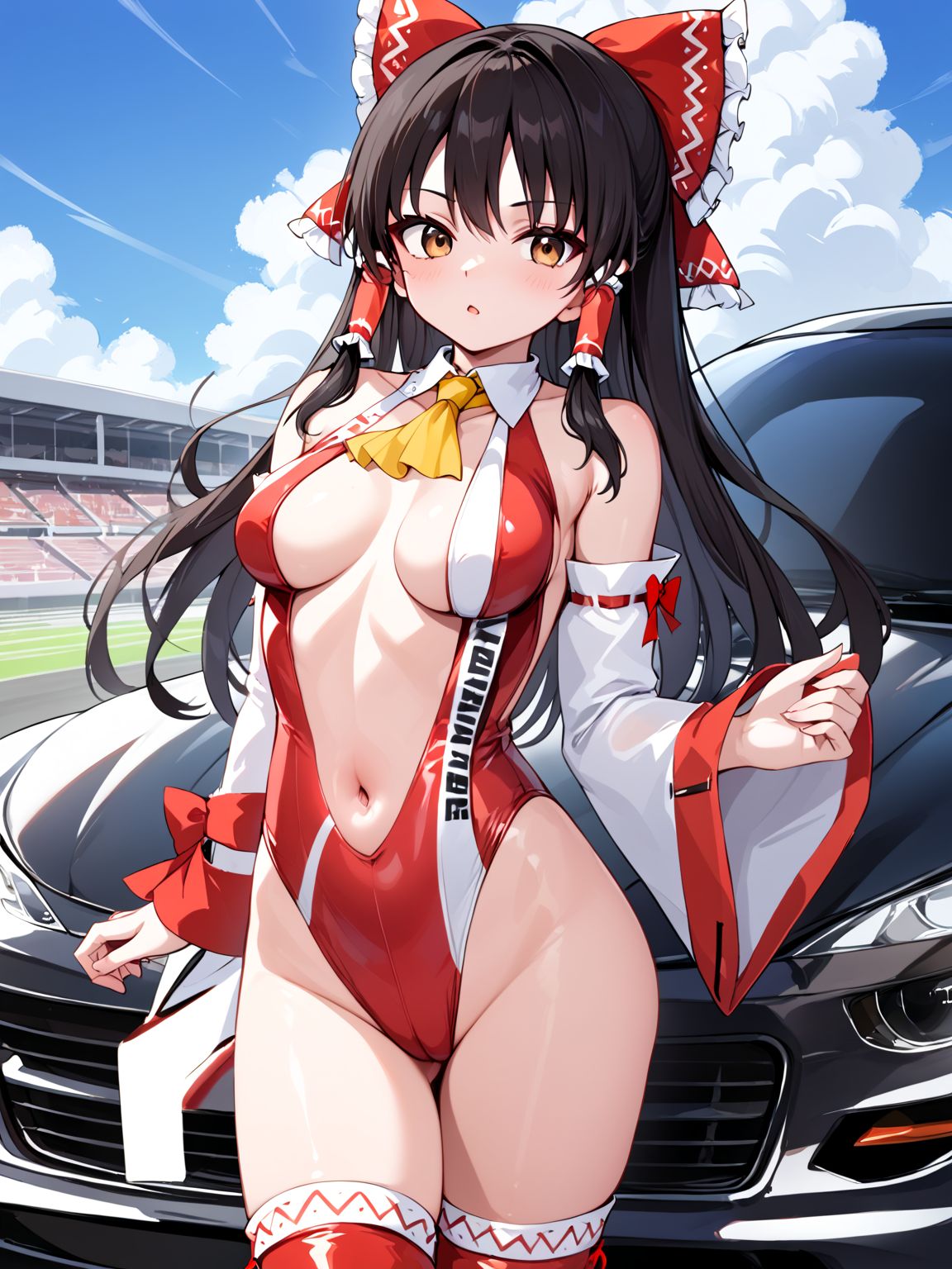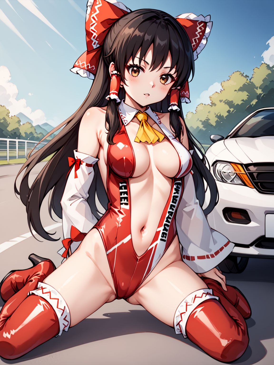 레이스 퀸, 하쿠레이 레imu, 가슴, 중간 크기 가슴, 애스콧, 노란 애스콧, 검은 머리, 긴 머리, 어깨 노출, 활, 갈색 눈, 분리된 소매, 흰 소매, 리본 장식 소매, 긴 소매, 프릴 장식 활, 프릴 머리 튜브, 프릴, 머리 튜브, 빨간 활, 머리 리본, 하이레그, 하이레그 레오타드, 레오타드, 등이 드러난 옷, 등이 드러난 레오타드, 빨간 레오타드, 옷에 쓰인 글자, 중앙 오픈, 배꼽, 배꼽 컷아웃, 빨간 신발, 리본, 리본 장식, 허벅지까지 긴 양말, 빨간 허벅지까지 긴 양말, 부츠, 허벅지 부츠, 하이힐 부츠, 하이힐