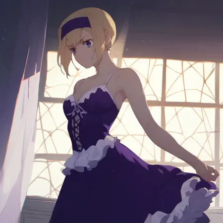 紫色束腰晚装,短裙,白色长手套,紫色头巾,大蝴蝶结后背
