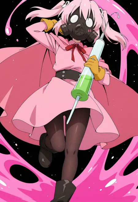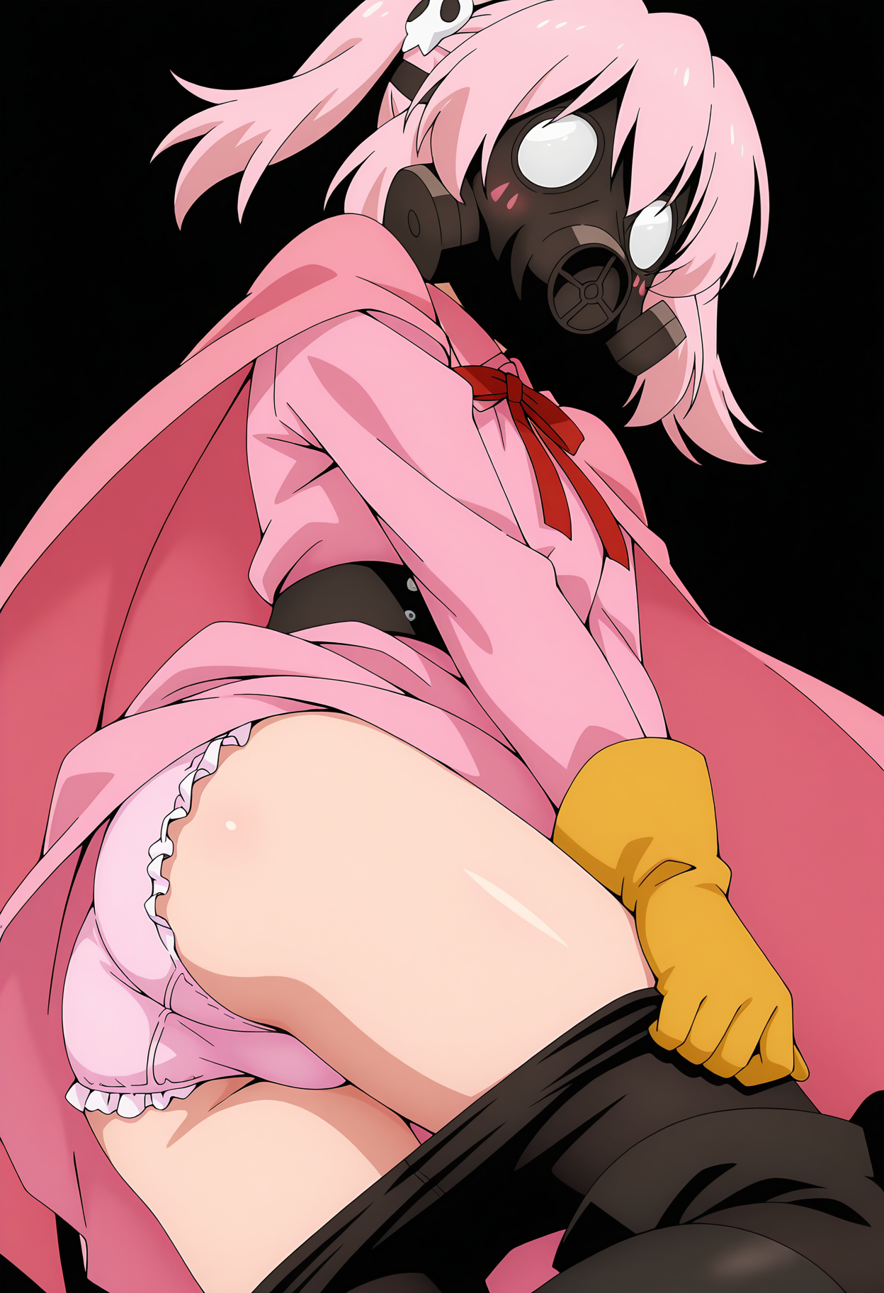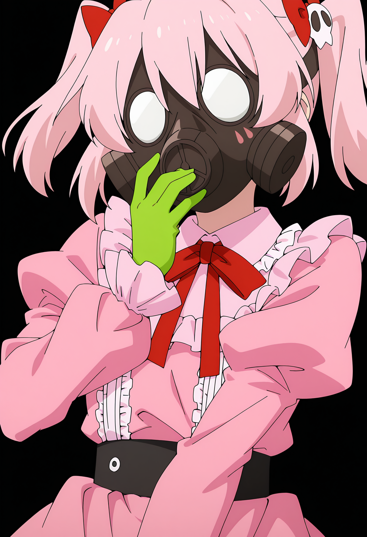 1girl, solo, pink, mask, gas mask, short hair, pink hair, bangs, two side up, short twintails, skull hair ornament