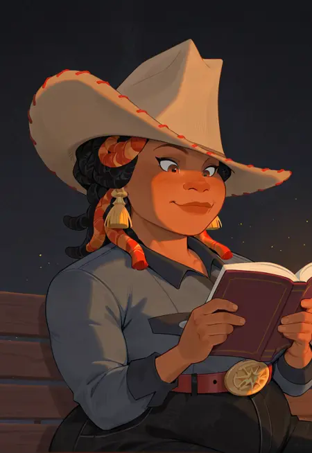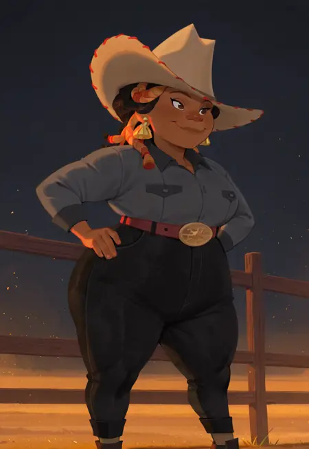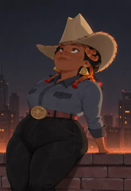 도움이 되는 키워드: 1girl, 감싸인 땋음, 카우보이 모자, 칼라 셔츠, 귀걸이, 바지, 벨트, 큰 벨트 버클, 카우보이 부츠