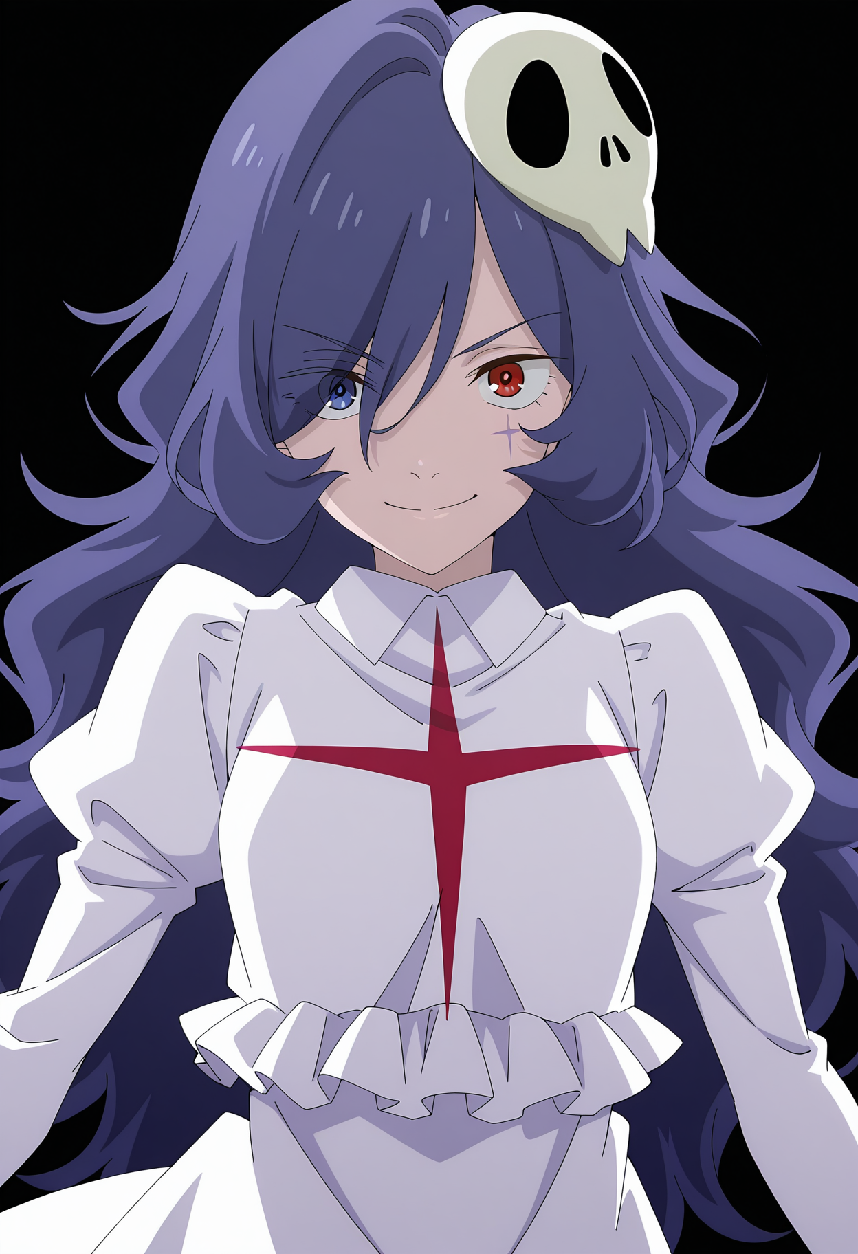1girl, solo, slayer, very long hair, blue hair, purple hair, heterochromia, blue eyes, red eyes, hair over one eye, eyes visible through hair, wavy hair, scar, hair ornament, skull hair ornament