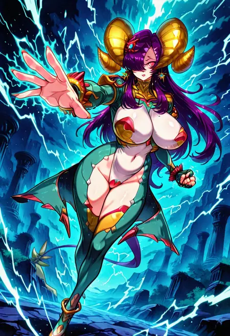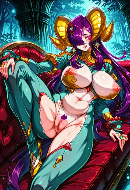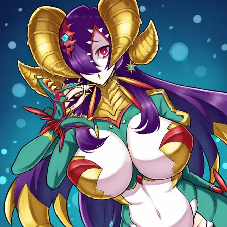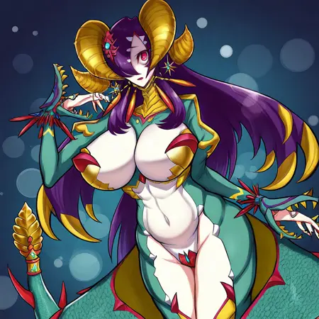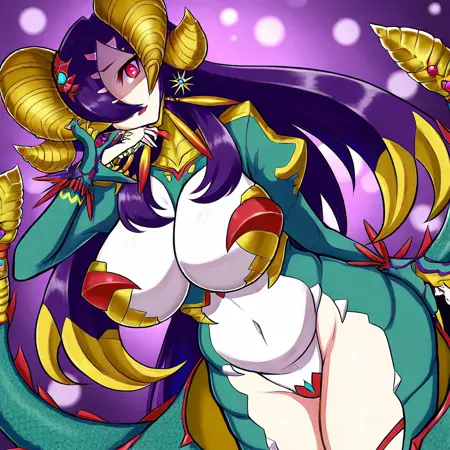 GargorgonMS, 1소녀, 솔로, 몬스터 걸, 구체화, 곡선 몸매, 모래시계 체형, 긴 흐르는 보라색 머리카락, 큰 곡선형 금색 뿔, 머리 장식, 수직 동공을 가진 선명한 붉은 눈, 두꺼운 입술, 귀걸이, 한쪽 눈을 가린 머리카락, 거대한 가슴, 천연색과 금색 갑옷 판으로 만든 몸에 딱 붙는 상의, 배, 생식기, 배꼽, 금팔찌, 복잡한 문양의 팔찌, 판타지 갑옷과 란제리 요소, 두 개의 카이주 꼬리, 넓은 엉덩이, 신발, 보석, 색상이 있는 피부,