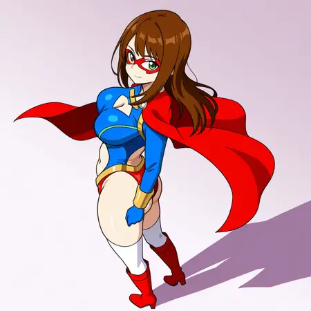spandexer_ca, 1girl, solo, brown hair, long hair, green eyes, domino mask, large breasts, red cape, leotard, navel, clothing cutout, white thighhighs, knee boots, red footwear