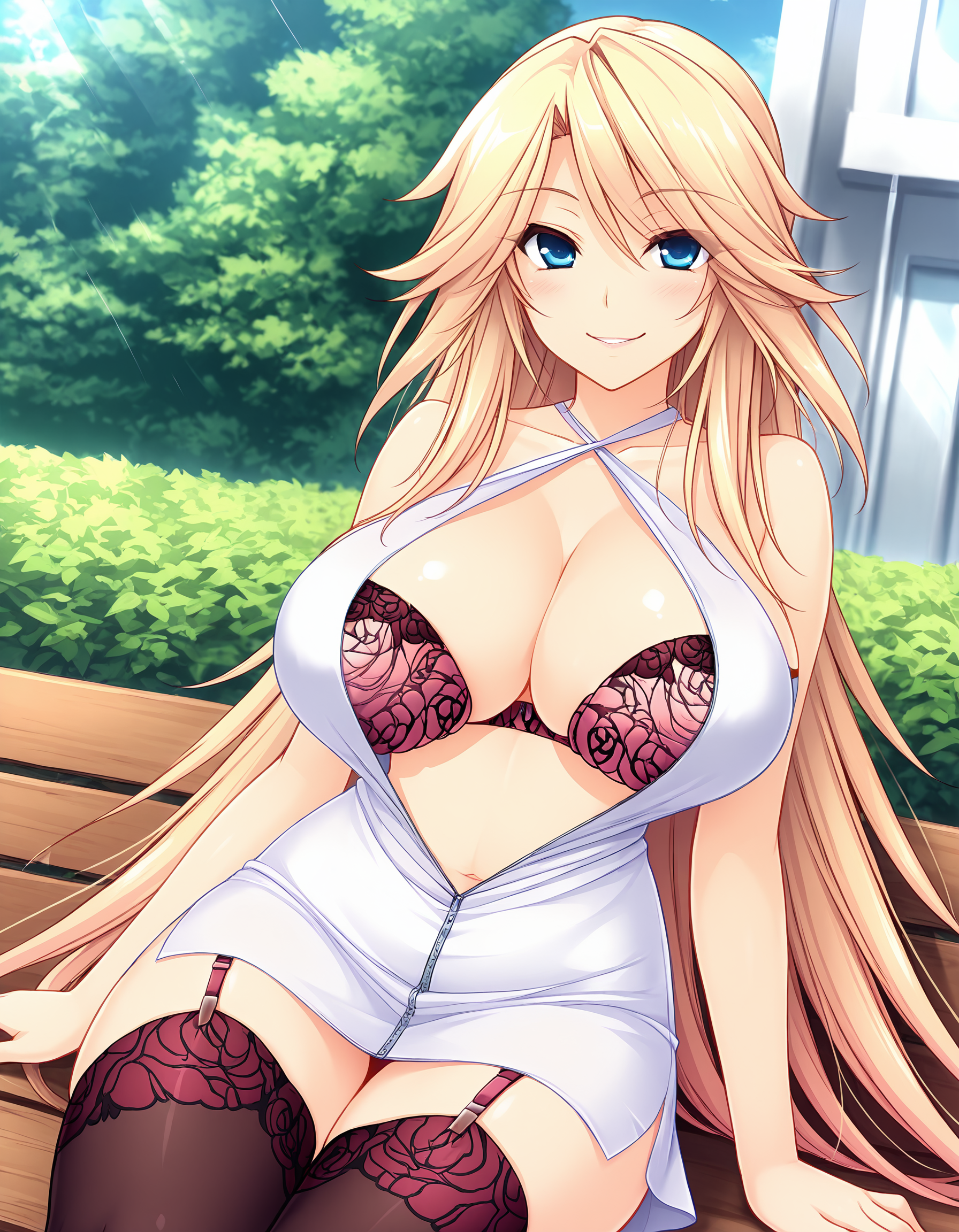 복장01, 드레스, 흰 드레스, 하이넥 크로스 드레스, 원피스 드레스, 짧은 드레스, 지퍼, 반 열린 지퍼, 속옷, 브라, 꽃무늬 프린트 속옷, 레이스 브라, 분홍 속옷, 서스펜더, 분홍 서스펜더, 히어스타킹, 검정 히어스타킹, 꽃무늬 프린트 히어스타킹, 젯타이 리오키, 하이힐, 흰 히어힐,
