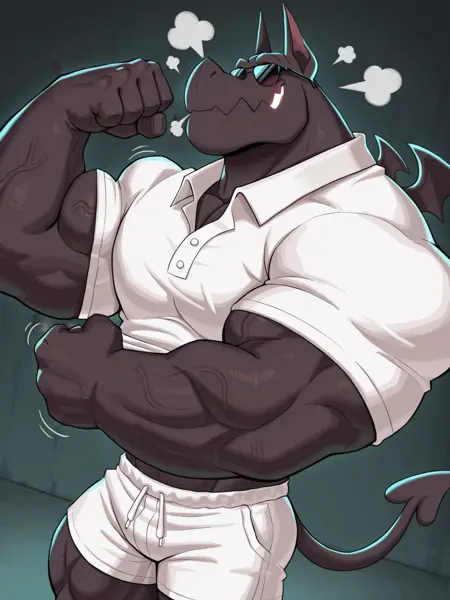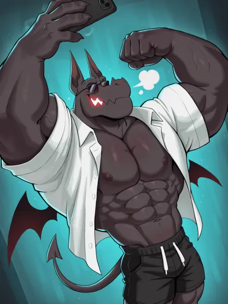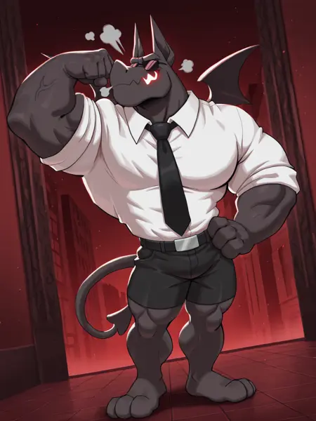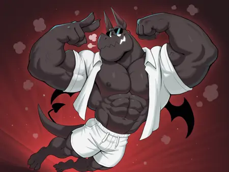 健壮男性,石像鬼男孩,小翅膀,短裤,白色眼睛,无瞳孔,锯齿状下颌,发光的嘴巴,黑色身体,商务着装,耳机,太阳镜,BR4D,