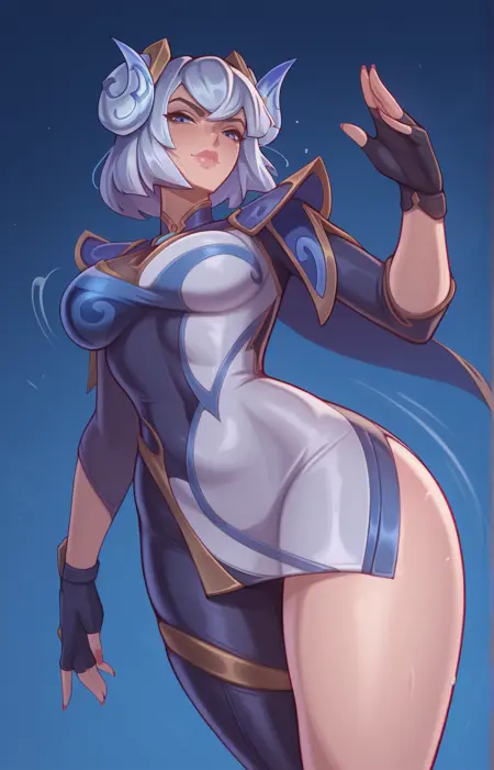 Porcelain_irelia, 아시아 소녀, 단발, 푸른 하얀 머리, 곧은 머리, 푸른 눈, 양 뿔, 마른 체형, 푸른 드레스, 푸른 및 흰 갑옷, 금장식, 장식된 어깨판, 짧은 드레스, 짧은 망토, 비대칭 양말, 손가락 없음 장갑,