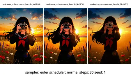 기본 애니메이션 스타일 포함: 이 버전에서는 데이터셋 내 애니메이션 이미지의 비중이 높아 기본 애니메이션 스타일(편향)이 존재합니다. 사용이 간단하지만, 모델이 어떤 프롬프트를 주어도 항상 기본 애니메이션 스타일을 생성하므로 "창의성"이 낮습니다. 일반적인 애니메이션 스타일만 원하고 스타일 프롬프트를 사용하고 싶지 않은 경우 유용합니다.