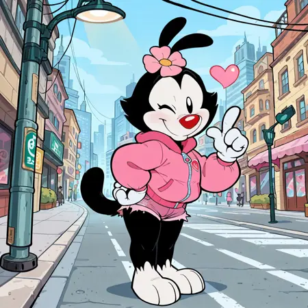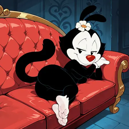 Dotw, black fur, white face, red nose, white feet, white gloves, head flower, pink skirt,