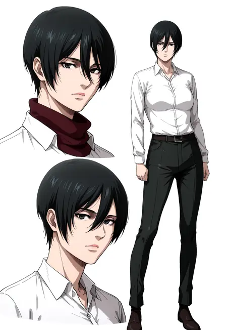 mikasa_ackerman_S4,红围巾,1girl,黑眼睛,黑发,短发,头发遮眼,白色背景,简洁背景,注视观众,胸部,
