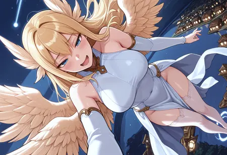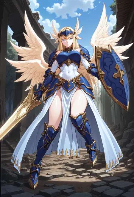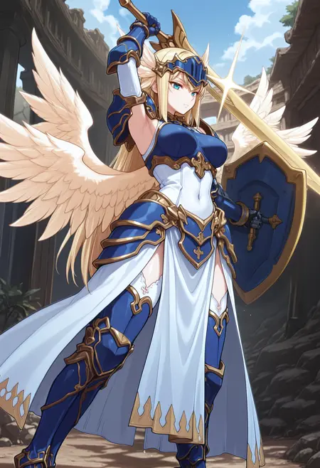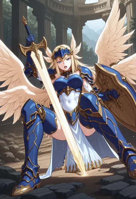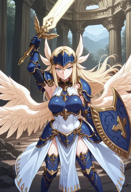 ValkyrieMGE, 1girl, 蓝色眼睛, 金色头发, 长发, 翅膀, 羽毛翅膀, 乳房, 天使翅膀, 头部翅膀, 四对翅膀,