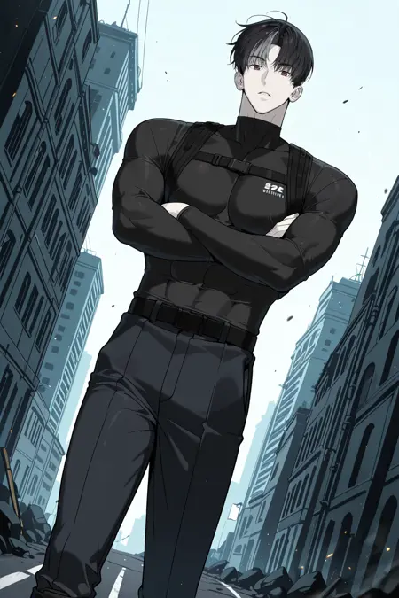 검은 셔츠, 타이트한 셔츠, 하네스, 군복, 군복 바지, 검은 벨트, 드러난 복부, 드러난 유방, 긴 소매, 검은 부츠,