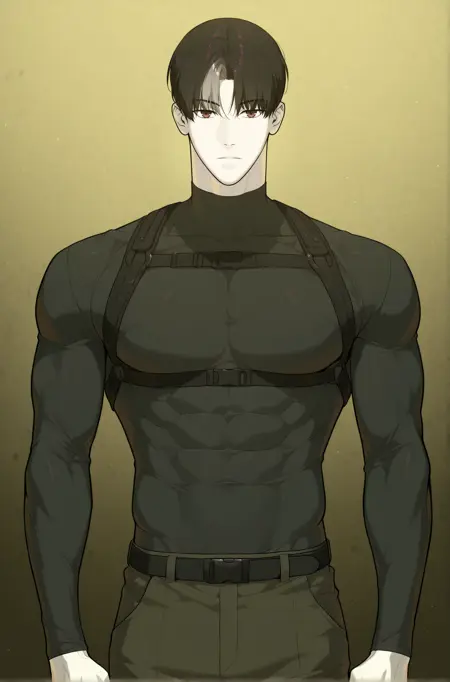 black shirts, tight shirts, harness, military_uniform, military pants, black belt, covered abs, covered pectorals, long sleeves, black boots,