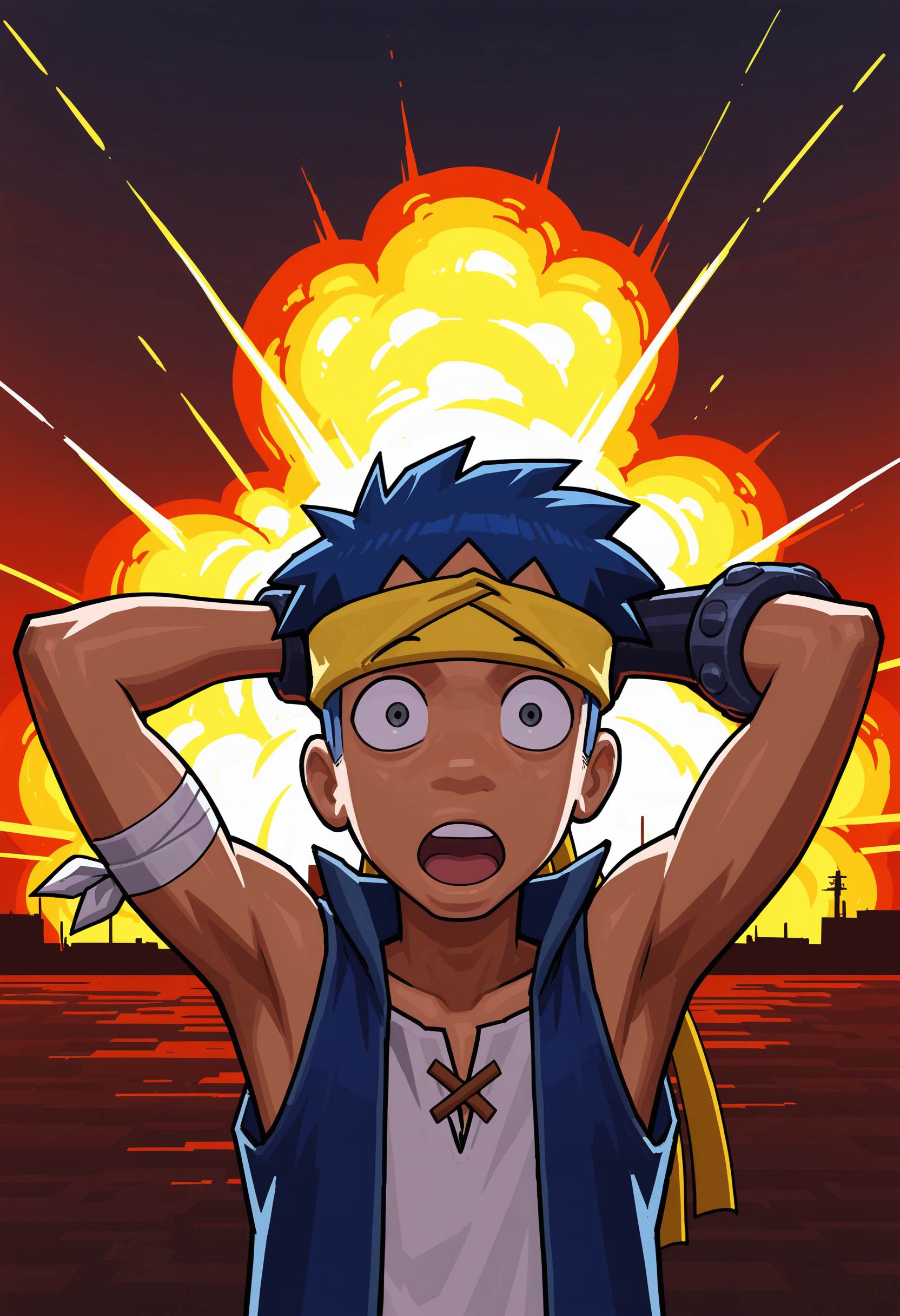 1boy, b0lo, blue hair, yellow headband, black eyes, bandage, bandage on right arm