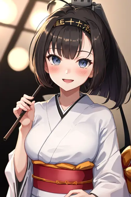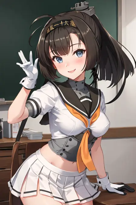 トリガーワードはakizuki_kantaicollection、推奨タグはbest quality, masterpiece, highres, solo, {akizuki_kantaicollection:1.15}, black_hair, ponytail, headband, long_hair, hachimaki, blush, serafuku, blue_eyes, open_mouth, ahoge, breastsです。