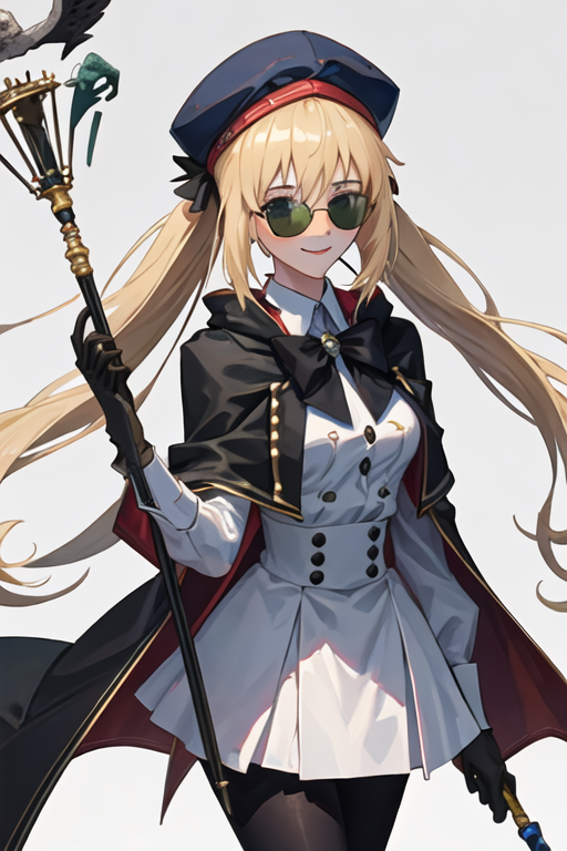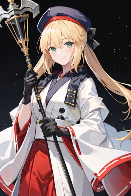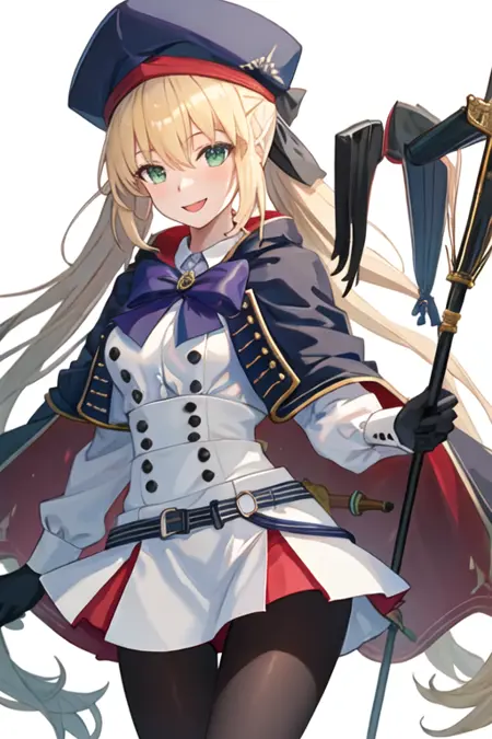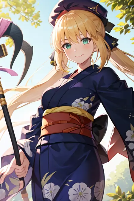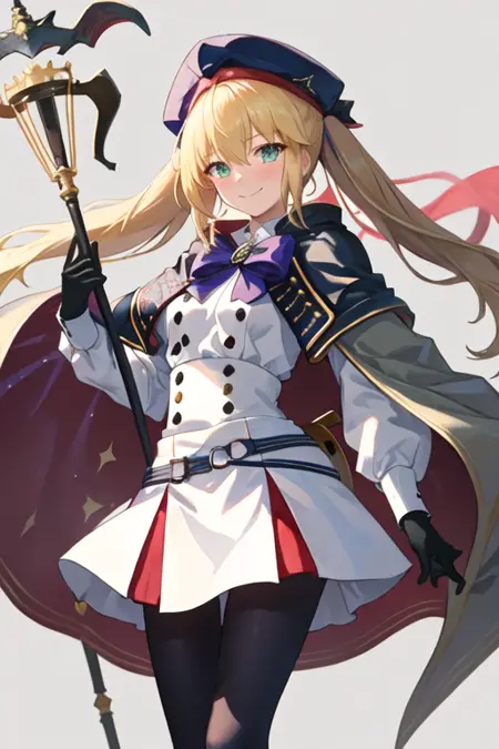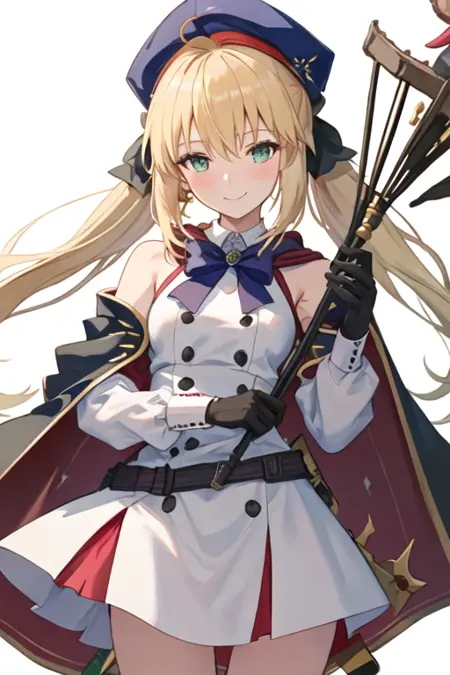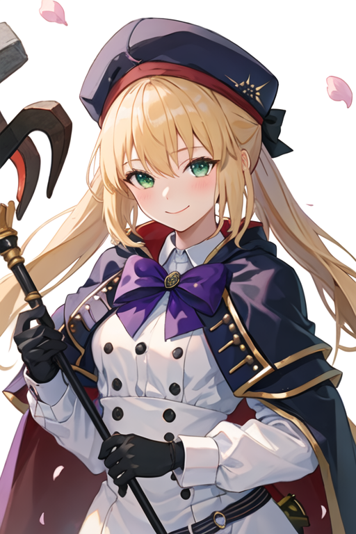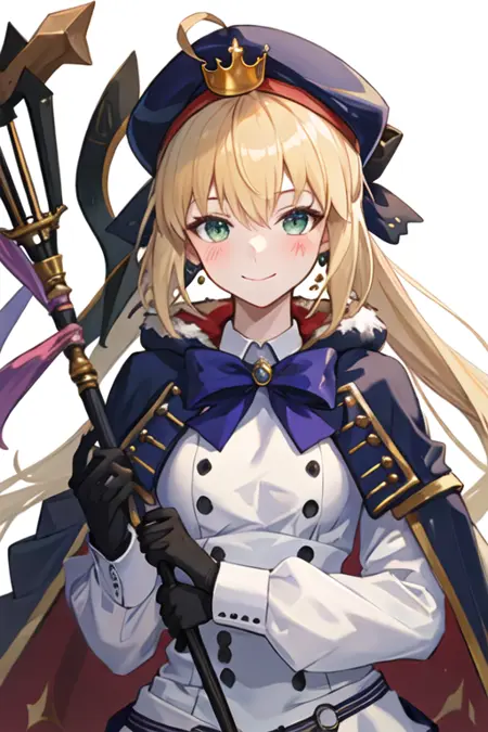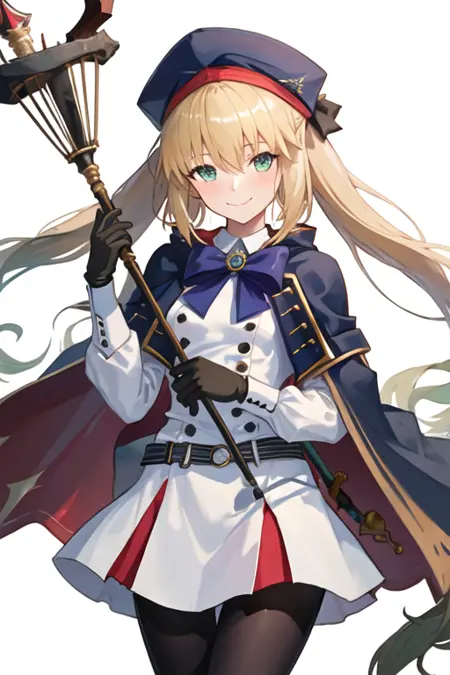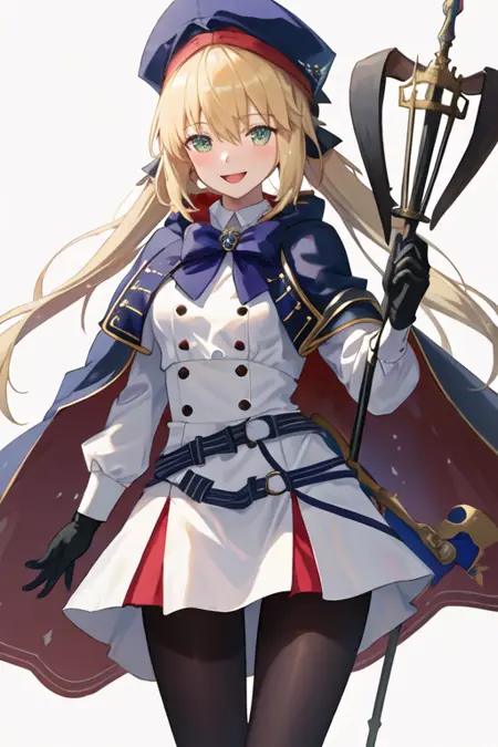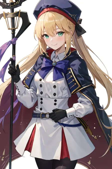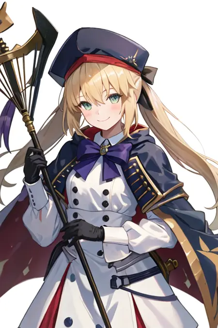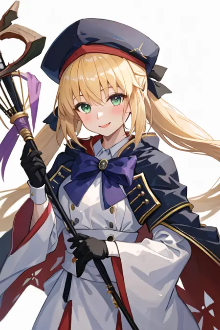 トリガーワードはaltria_caster_fgoで、推奨タグはbest quality, masterpiece, highres, solo, {altria_caster_fgo:1.15}, blonde_hair, long_hair, green_eyes, bangs, twintails, bow, hat, smile, hair_between_eyes, staff, cape, blush, blue_headwear, buttons, beret, closed_mouth, breastsです。