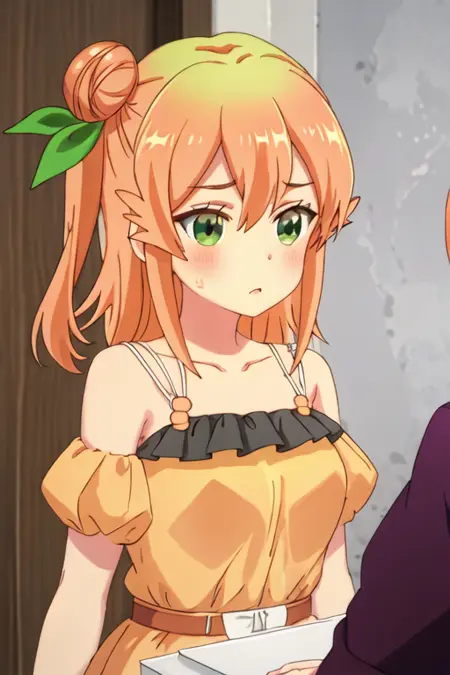 触发词为 hinatsuki_mikan_thedemongirlnextdoor,推荐标签为:best quality, masterpiece, highres, solo, {hinatsuki_mikan_thedemongirlnextdoor:1.15}, orange_hair, hair_bun, single_hair_bun, ribbon, hair_ribbon, green_eyes, hair_ornament, blush, single_side_bun, long_hair, green_ribbon, hair_between_eyes, collarbone, shiny_hair。
