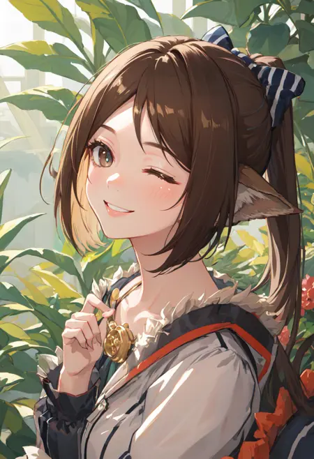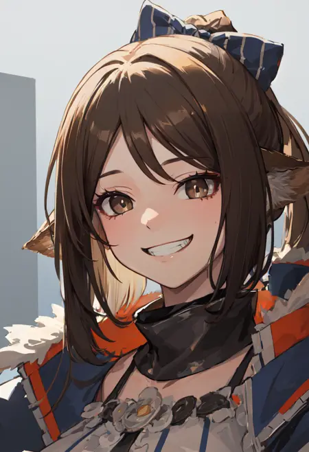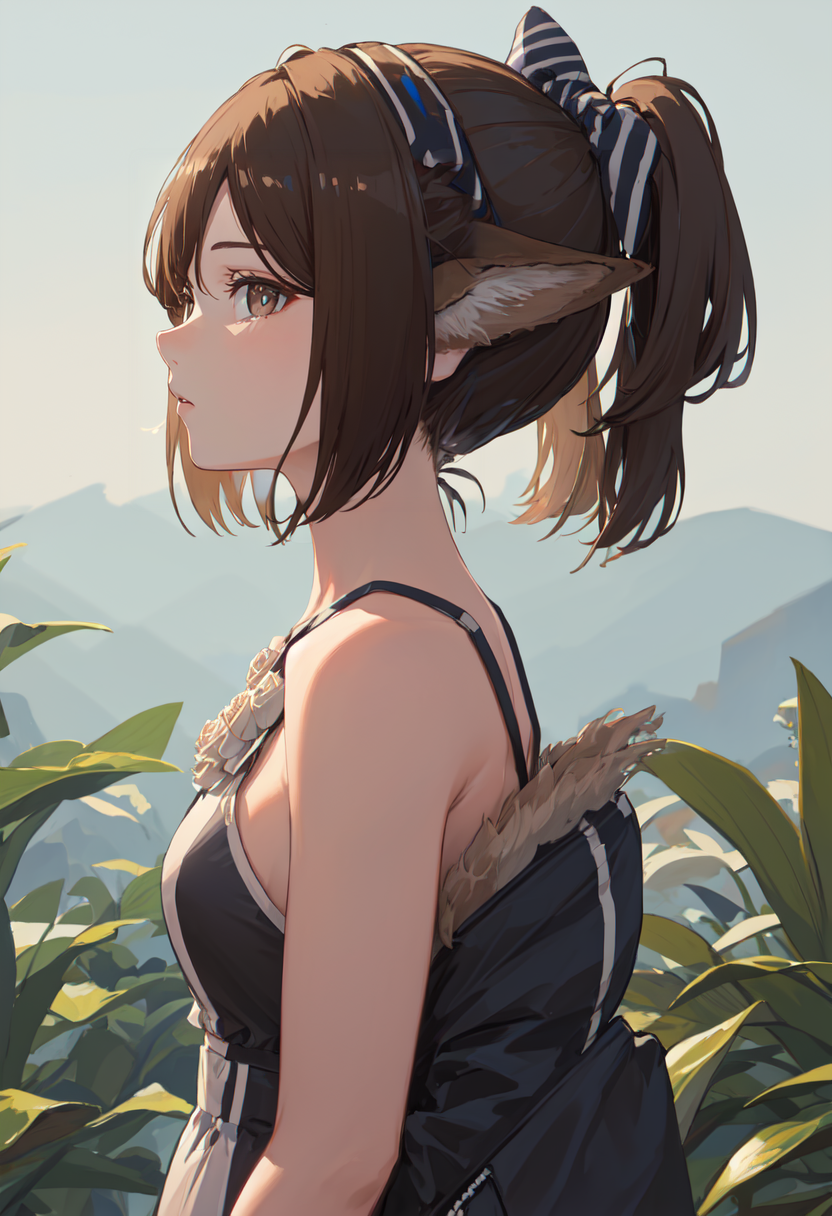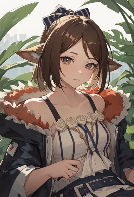 - プリューンされたキャラクタータグは、動物の耳、茶色の髪、狐の耳、ポニーテール、リボン、髪のリボン、茶色の目、長い髪、青いリボン、狐の女の子、胸、尾、縞模様のリボンです。キャラクターのコアな特徴(例:髪の色)が安定しない場合、これらのタグをプロンプトに追加できます。