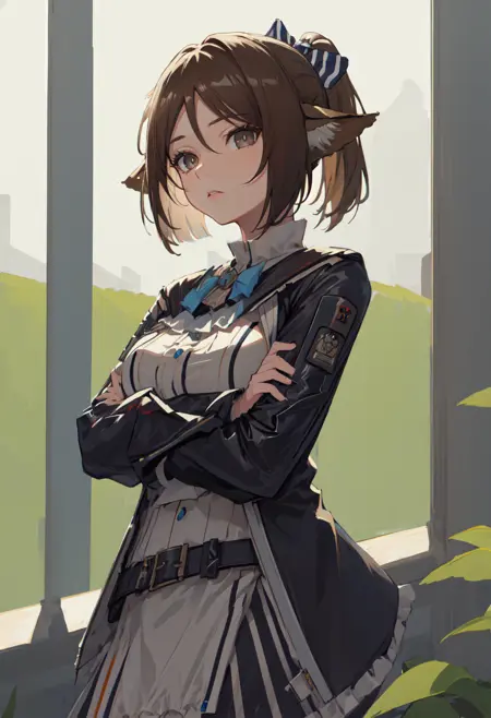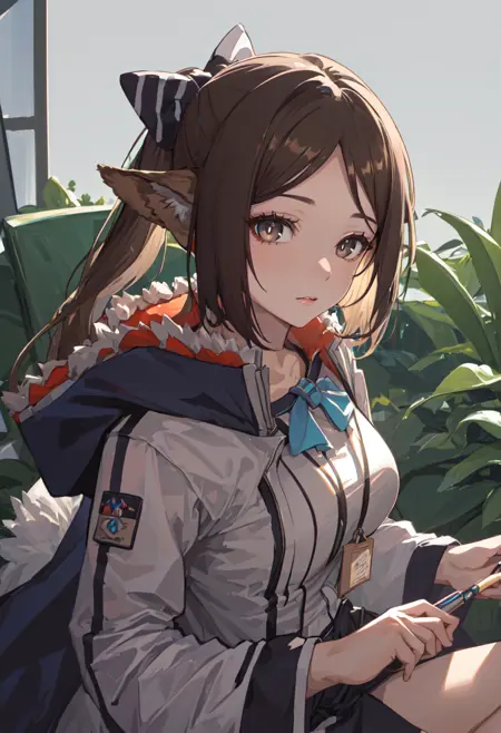 トリガーワードはperfumer_arknights、プリューンされたタグはanimal_ears, brown_hair, fox_ears, ponytail, bow, hair_bow, brown_eyes, long_hair, blue_bow, fox_girl, breasts, tail, striped_bowです。ある時、特定の特徴(例:髪の色)が安定しない場合は、これらをプロンプトに追加できます。