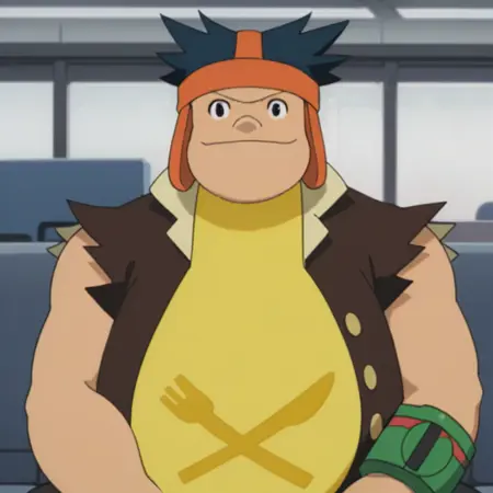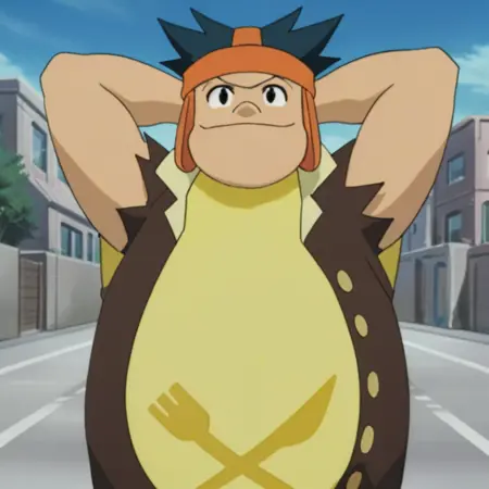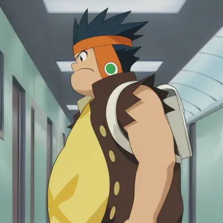 提示:男性,胖,深青绿色头发,刺猬头,发带,黑色眼睛,连眉,连体服,背心,撕裂的袖子,无袖,棕色鞋子,室内(教室/课桌/课椅/黑板/门),室内(走廊/天花板),室外(社区/天空/道路/房屋/灌木/建筑),室外(公园/小径/长椅/树/水体/城市景观)