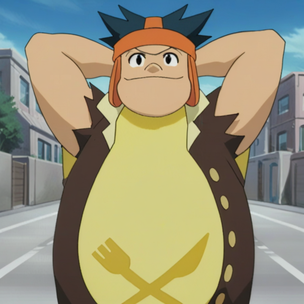 プロンプト:男性、肥満、ダークティールの髪、とがった髪、ヘッドバンド、黒い目、一本眉、ジャンプスーツ、ベスト、裂けた袖、ノースリーブ、茶色の靴、屋内(教室/学校の机/学校の椅子/黒板/ドア)、屋内(廊下/天井)、屋外(住宅街/空/道路/家/茂み/建物)、屋外(公園/道/ベンチ/木/水/都市風景)