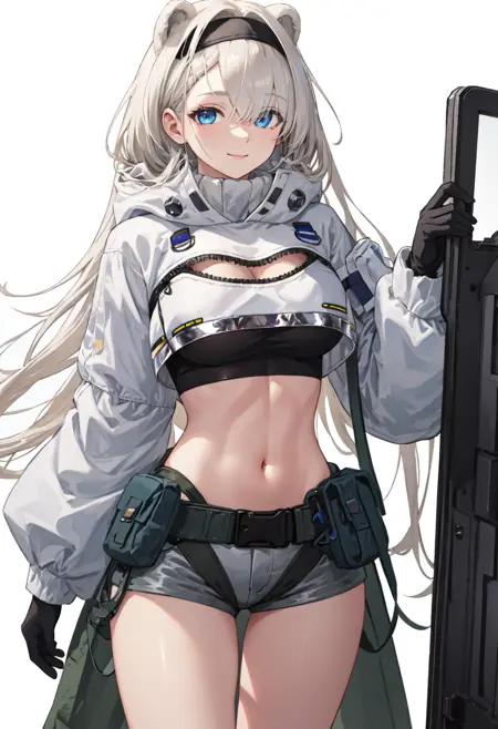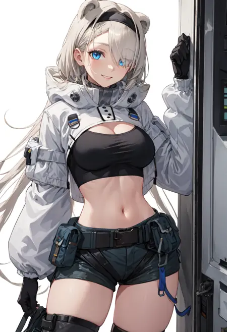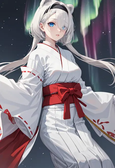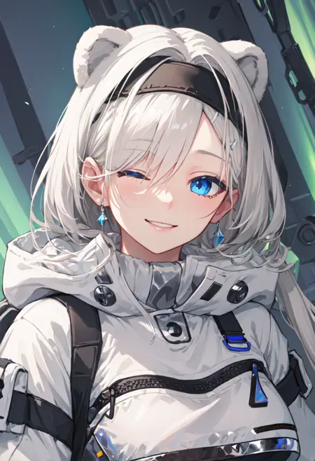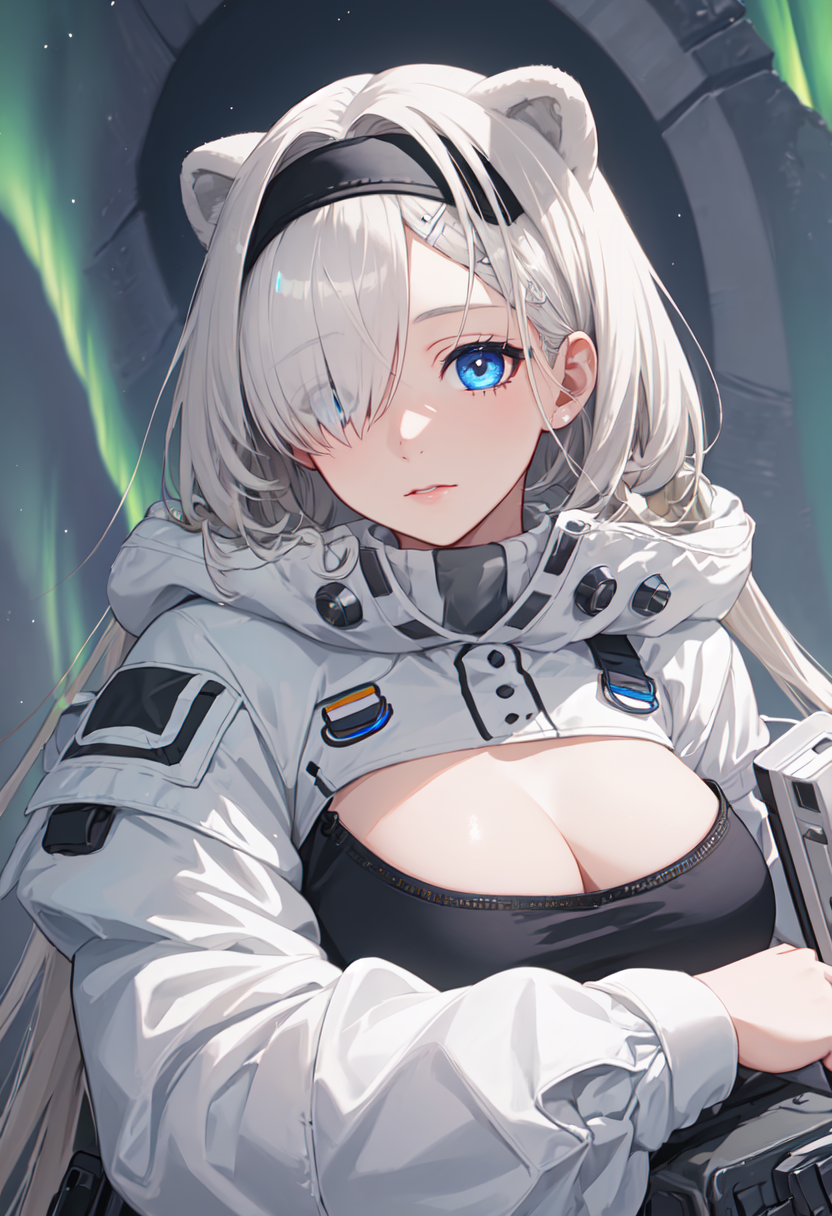 トリガーワードはaurora_arknightsで、削減されたタグはanimal_ears, bear_ears, blue_eyes, breasts, hairband, black_hairband, long_hair, hair_over_one_eye, large_breasts, white_hair, very_long_hair, grey_hair, eyes_visible_through_hairです。ある特徴(例:髪の色)が安定しない場合、これらのタグをプロンプトに追加できます。