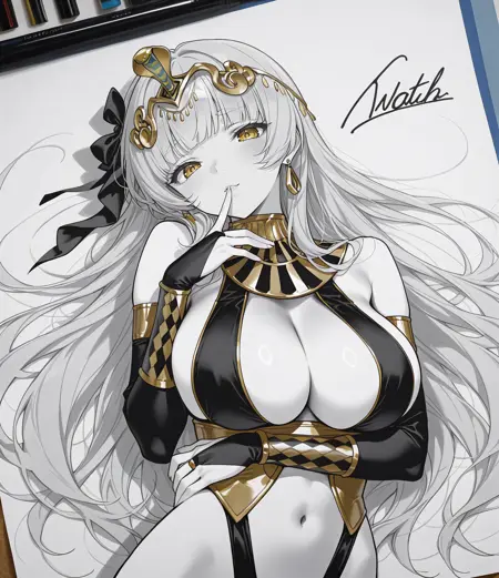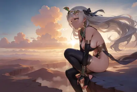 Bartdance, blunt bangs, yellow eyes, very long hair, silver hair, bangs, wavy hair, black hair bow, large breasts, earrings, sideboob, cleavage, usekh collar, bare shoulders, circlet, snake ornament, armlet, snake armband, black elbow gloves, bridal gauntlets, harem outfit, gold sash, sash, underbust, navel, gold trim, revealing clothes, black leotard, highleg, black thighhighs, toeless legwear, stirrup legwear,