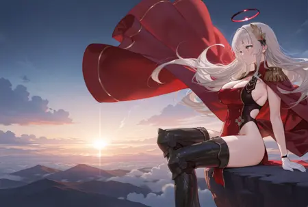 Bartbase, blunt bangs, yellow eyes, very long hair, silver hair, bangs, wavy hair, hair ornament, large breasts, cleavage, sideboob, mechanical halo, red halo, epaulettes, high collar, red leotard, high-cut leotard, sleeveless, double-breasted, pelvic curtain, covered navel, asymmetrical gloves, white gloves, red cape, long cape, gold trim, black thigh boots, armored boots, single glove,