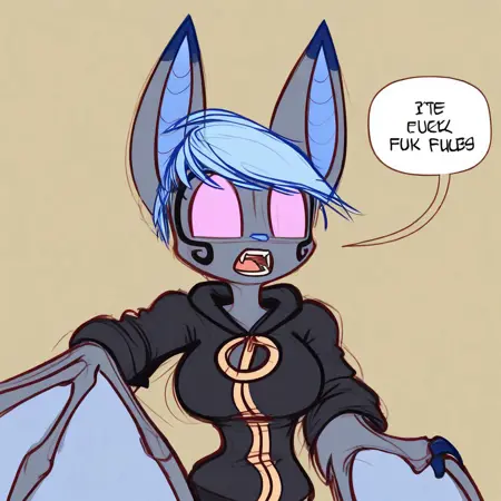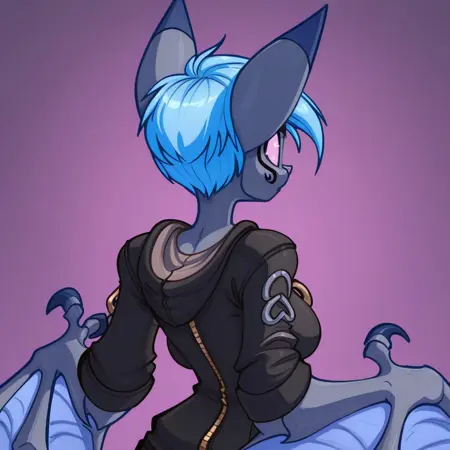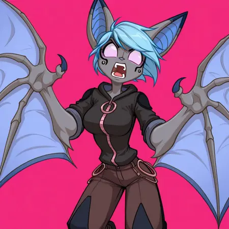 vanth, dreamkeepers, 1girl, bat girl, bat ears, animal ears, furry, furry female, solo, bat wings, pink eyes, blue hair, short hair, breasts, claws, animal nose
