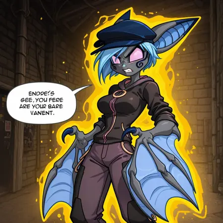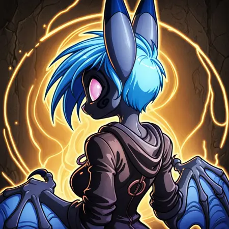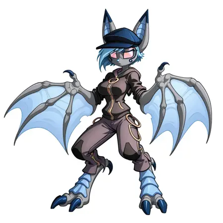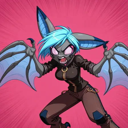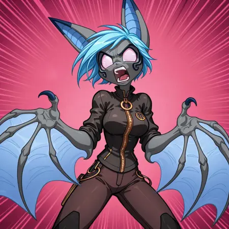 vanth, dreamkeepers, 1girl, bat girl, bat ears, animal ears, furry, furry female, solo, bat wings, pink eyes, blue hair, short hair, breasts, claws, animal nose