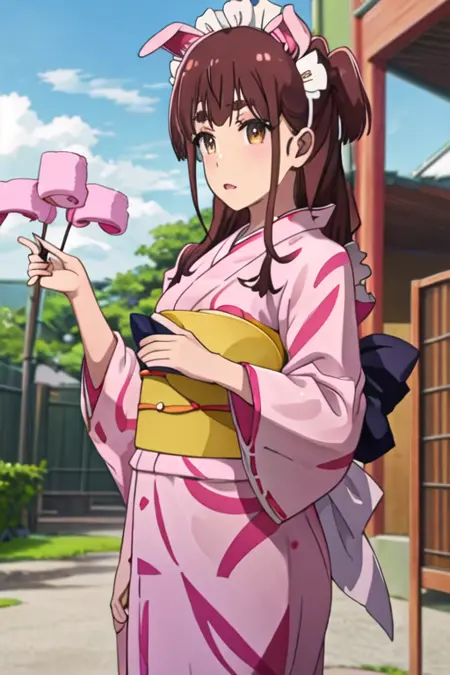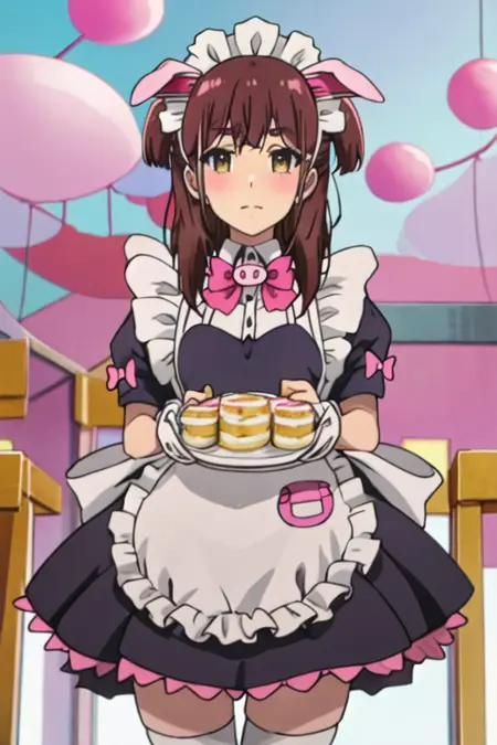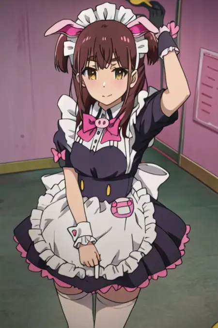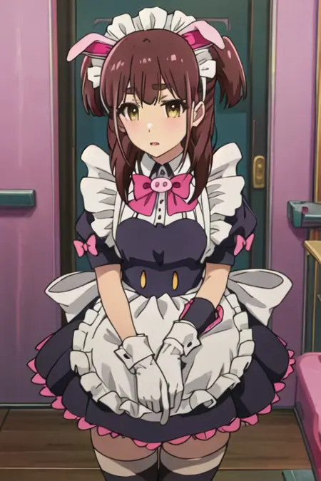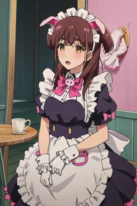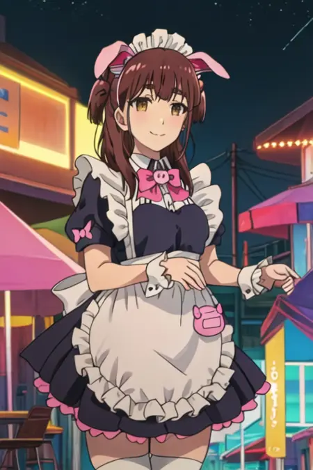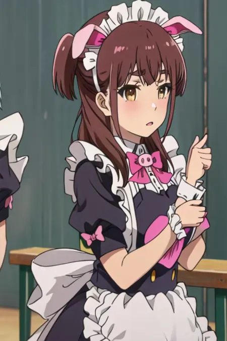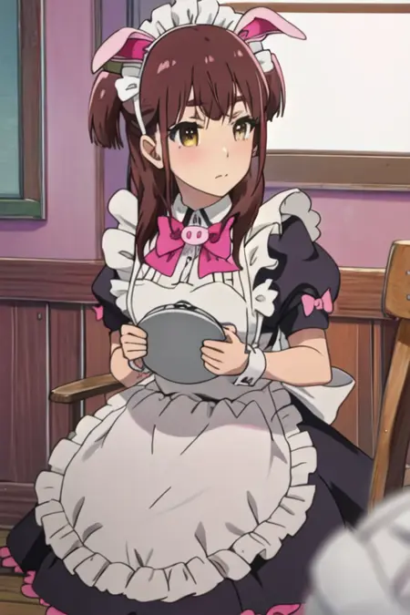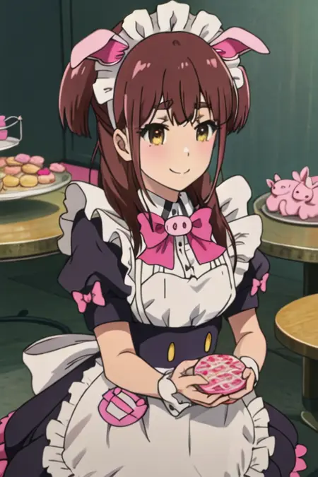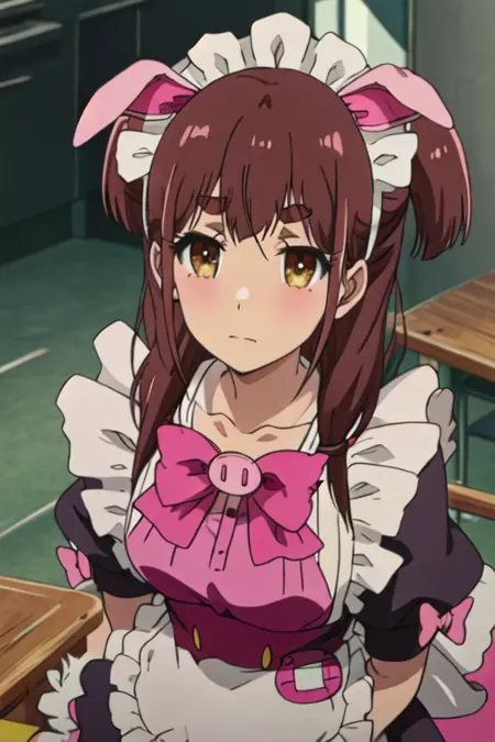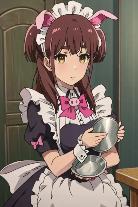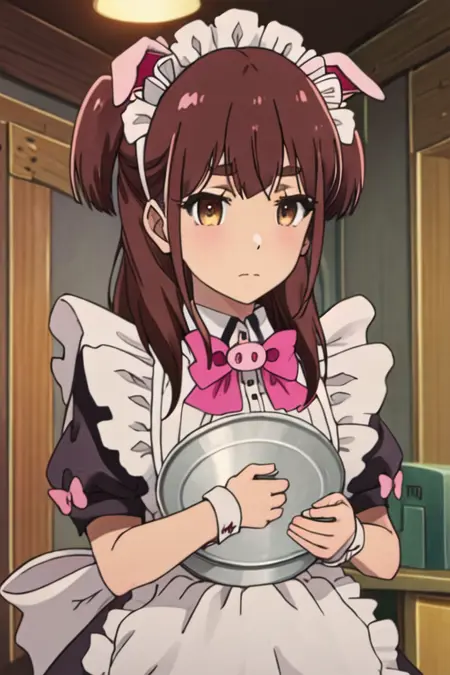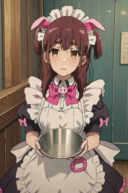 トリガーワードは wahira_nagomi_akibameidosensou であり、推奨タグは best quality, masterpiece, highres, solo, {wahira_nagomi_akibameidosensou:1.15}, brown_hair, maid_headdress, brown_eyes, animal_ears, bow, fake_animal_ears, long_hair, pig_ears, maid_apron, yellow_eyes, pink_bow です。